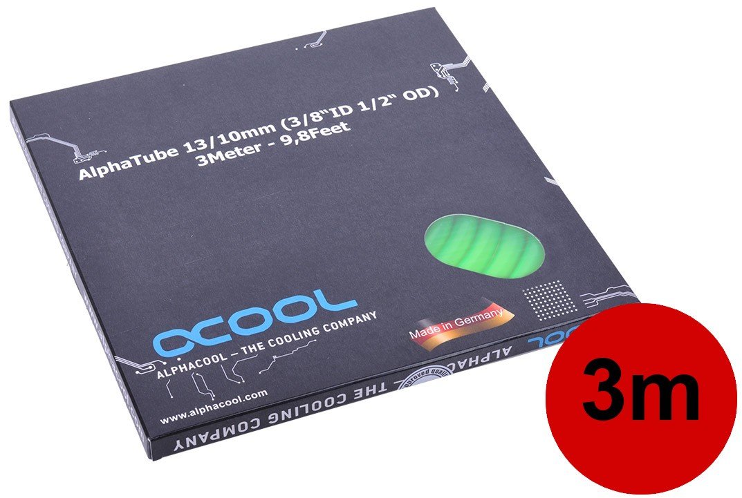 Alphacool tubing AlphaTube HF 13/10 (3/8"ID) - UV green 3m (9,8ft) Retailbox Tootekood: 18415 GTIN: 4250197184151 Tubing for water cooling Deep, intense colors, pleasant handling and easy installation were the goals when developing this tubing generation. The result is a great choice of sizes and colors such as red, green, blue or black.When designing these tubes, one goal was to make colored coolant and hence the strain from coloring particles on the cooling loop obsolete. With these tubes the color comes from the tubes themselves.Besides color, the installation and kinking properties are always an important factor when choosing tubing. Tight bending radiuses and easy handling in tricky situations were also taken into consideration during development. Hence the plastic mixture was developed to perfection and we have created tubing which manages to combine usually opposing properties to please both beginners and advanced users. Manufacturing in Germany promises permanently high quality. The manufacturing with years of experience ensures the best product all of the time!Technical specifications:Material: PVCColor: UV greenInner diameter: 10mm, 3/8“Outer diameter: 13mm, ½“Wall thickness: 1,5mm, 1/15“Extent of delivery:1x Alphacool Schlauch AlphaTube HF 13/10 (3/8"ID) - UV Grün 3m (9,8ft) Retailbox | 14,50 € | Poodi | ||