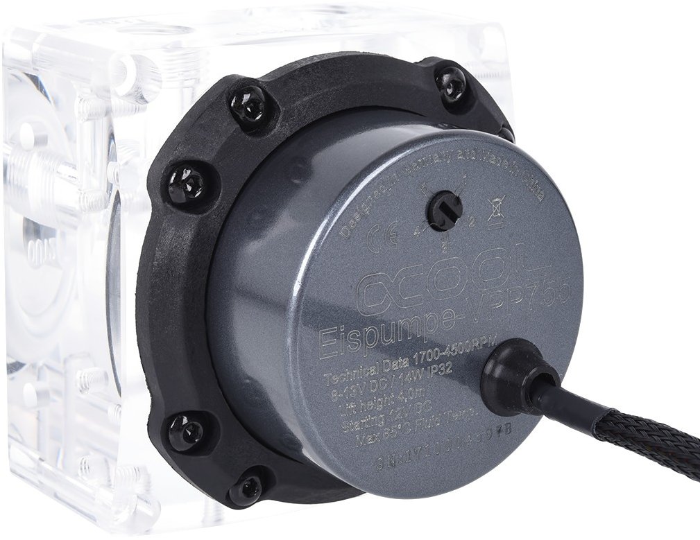Alphacool VPP655 PWM - G1/4 inner thread including Eisdecke D5 - Acetal V.3 Tootekood: 13194 GTIN: 4250197131940 Pumps for water cooling Alphacool's attachment for the Laing D5 is now a member of the Eisdecken series and receives an update.This attachment has been a benchmark for years. Small improvements have been made time and again. The second major update differs in a few details, both visually and technically.The principle: There is space for the Laing D5 or VPP655 on the bottom and inlet and outlet at the front or on the top.For even more flexibility, the ice cover has three inlets and two outlets. Another feature is the new bracket to give the whole unit a stable stand and round off the overall visual appearance. Installation in a 3.5" slot is also possible as an option.The attachment can be converted into a complete expansion tank with the help of the expansion tank attachment available as an accessory, which has also been revised.Alphacool VPP 655Alphacool's new power pump series, unique performance at an unbeatable price. The 12V pumps can simply be connected to the power supply and the pump starts up together with the computer! This ensures maximum comfort and the greatest possible safety.This pump is ideal for water cooling PCs and other electronic components. The DC motor pump is equipped with an electronically commutated spherical motor. In a pump with a spherical motor, the only moving part is a spherically shaped rotor, which in this case rests on a bearing ball made of ultra-hard and wear-resistant ceramic. The spherical bearing of the rotor offers a number of advantages: For example, an increase in bearing play is not possible due to the design, and the pump will always run consistently quietly and smoothly. Separate magnetic shielding is also not necessary with this pump. The spherical motor principle allows efficient operation with excellent performance. All parts of the pump are completely corrosion-resistant. The pump is simply operated on a 12V Molex connection of the PC power supply. Technical data attachmentDimensions80 x 80 x 40mmDimensions with feet83 x 80 x 87mmMaterialAcetalConnections5x 1/4" threadTechnical data VPP 655Dimensions (WxHxD)65x65x57mm (without connections)MotorElectronically commutated spherical motorStandard voltage12V direct voltagePower consumption23WPermitted voltage8-24V direct voltagePressure at 12V3.7m water columnMaximum flow rate350l/hPumpmediumWater, water/glycol mixtureMaximum system temperature60°CRelated materialsStainless steel 1.4571, PPS-GF40, EPDM O-rings, aluminum oxide, hard carbonPower connection4 Pin MolexWarranty: 2 years???? Warranty Terms | 124,70 € | Poodi |