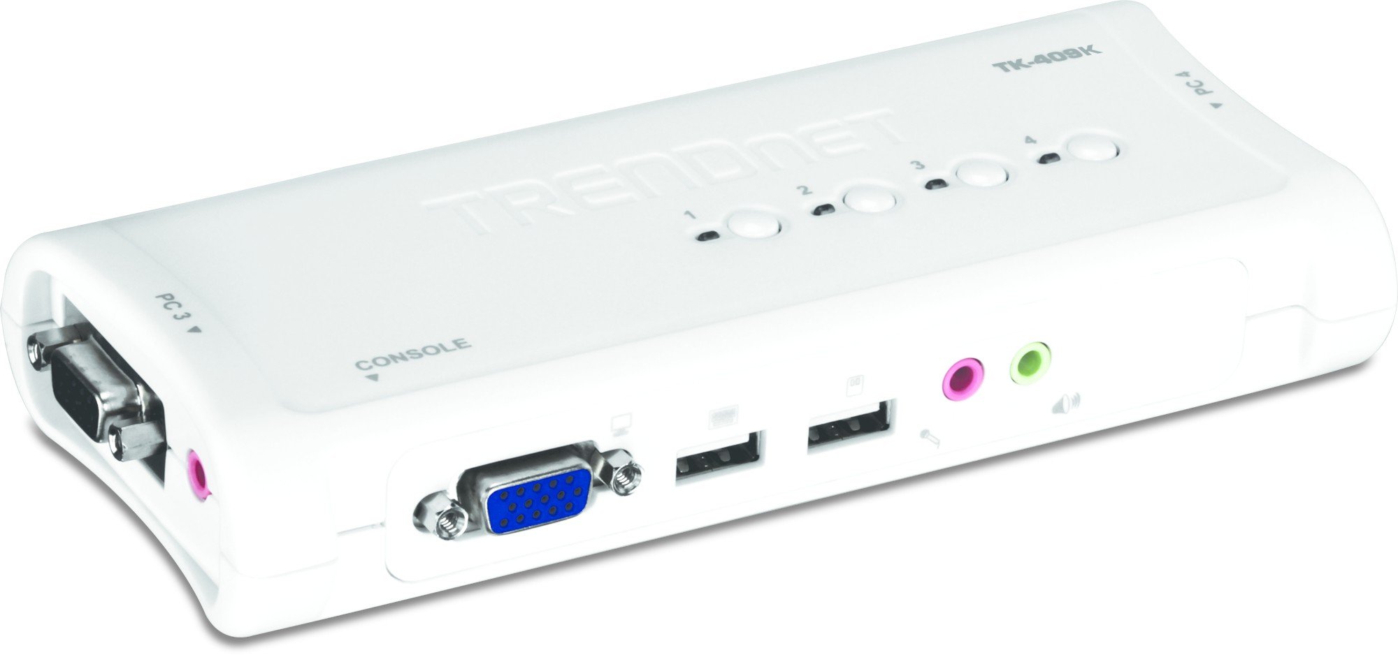 4-Port USB KVM Switch KitTK-407K (Version v1.3R)4-Port KVM switch with VGA and USB connections to computersDevice monitoring with Auto-Scan and audible feedbackHigh quality 2048 x 1536 resolution for a crisp displaySupports most operating systems and advance mouse designsAll required cabling included The 4-Port USB KVM Switch lets you manage four PC’s with just one set of keyboard, monitor, and mouse. Switch between 4 PC’s with a simple press of a button! Separate sets of KVM cables are included with the KVM Switch, so users can start controlling 4 PC’s instantly. The KVM cables also provide power to the KVM Switch, eliminating the need for a power adapter. Hot Key operations provide immediate access to features such as computer switching, and auto-scanning. With its Hot-Plug, and Audible Feedback, the 4-Port USB KVM Switch is the perfect choice for managing multiple PC’s.Control up to 4 computers / servers with one set of console devicesUSB keyboard / mouse emulation with 4 sets of detachable KVM cablesCompliant with Windows, Linux, and Mac OSHigh video quality, up to 2048 x 1536 VGA resolutionAuto-Scan and LED display for computer monitoringKeyboard status restored when switching between computersComputer selection by front panel push buttons, keyboard hot key commands or Windows-based client switching software*User definable hot key (Windows only)Plug & Play and hot-pluggableUSB interface power method2-year limited warranty* Please go to http:/www.trendnet.com/downloads to download the client switching software