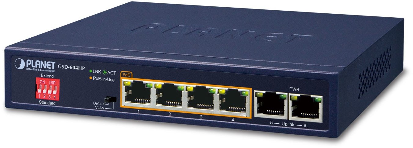 Cost-effective IP Surveillance System Solution PLANET’s new GSD-604HP provides four 802.3at PoE+ ports for catering to small-scale IP surveillance or home networks at a lower total cost. With Dual 10/100/1000BASE-T uplink ports, the recorded HD video streams from the 4 PoE IP cameras can be powered by the GSD-604HP and saved in the 4-channel NVR systems or surveillance software to perform comprehensive security monitoring and manage the surveillance system in the LAN or the remote site via Internet.The GSD-604HP’s advanced features are as follows:Four PoE+ port with a total budget of 65 watts Two 10/100/1000Mbps uplink ports Port-based VLAN Compact size, fanless designExtended modeTwo Gigabit Uplink Ports The GSD-604HP comes with two uplink ports with 1000Mbps transfer rate to ensure high-speed data and video transmission, and reliable assurance for connection between the surveillance system and outside network where the four PoE+ ports can be used to their full potential.Innovative Port-based VLAN The GSD-604HP features “Port-based VLAN” whose ports can be isolated from each other via one DIP switch. This can help to prevent the IP camera’s multicast or broadcast storm from influencing each other, thus fully meeting the requirements of the IP surveillance systems and Ethernet projects.Standard, VLAN and Extend Operation Modes The GSD-604HP provides Standard, VLAN and Extend operation modes. The GSD-604HP operates as a normal IEEE 802.3at/af PoE switch in the standard operation mode.The VLAN operation mode features the port-based VLAN function that can help to prevent the IP camera’s multicast or broadcast storm from influencing each other.In the Extend operation mode, the GSD-604HP operates on a per-port basis at 10Mbps duplex operation but can support 20-watt PoE power output over a distance of up to 250 meters overcoming the 100m limit on Ethernet UTP cable. With this brand-new feature, the GSD-604HP provides an additional solution for 802.3at/af PoE distance extension, thus saving the cost of Ethernet cable installation. Its VLAN isolation function isolates ports so as to prevent broadcast storm and defend DHCP spoofing in the extend operation mode.Environment-friendly, Fanless Design for Silent OperationThe GSD-604HP comes with a desktop-sized, compact metal housing, making the placement of the unit convenient. It features a ventilated construction in which a cooling fan is not necessary, thereby making its operation noiseless. Moreover, the GSD-604HP is able to operate reliably and stably in any environment without affecting its performance. The deployment of PoE PDs with constant power feeding can be easily and quickly done. Robust ProtectionThe GSD-604HP protects against the ESD 6kV surge to improve product stability and also protects users’ networks from devastating ESD attacks, making sure the flow of operation does not fluctuate.Ideal Solution for SOHO Having Secure IP Surveillance InfrastructureTargeting the growing popular IP surveillance applications, the GSD-604HP PoE+ Switch is also positioned as a Surveillance Switch for a quick and easy PoE IP camera deployment with power feeding. The GSD-604HP supports both 802.3at and 802.3af PoE standards along with 4 10/100/1000BASE-T ports featuring up to 30 watts per RJ45 copper interface, and 2 extra Gigabit Ethernet TP interfaces supporting high-speed transmission of surveillance images and videos.