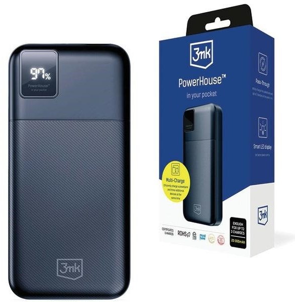 3MK PowerHouse 20000 mAh Powerbank Multi-Charge - Charge 3 devices and a power bank at the same time, thanks to the Multi-Charge technologyQuick Charge, Power Delivery - Use the fast charging Quick Charge 3.0 22.5W and 20W Power DeliveryPass-Through - With Pass-Through technology, you do not have to worry about the safety of your equipmentLED display - Control the battery charge level with one glance at the LED display Multi-Charge Technology You have to leave soon, and the battery is not only dying in your smartphone? Instead of looking for chargers and waiting, hit the road with PowerHouse! It is a capacious, 4-port power bank with Multi-Charge technology. It allows you to charge 3 mobile devices at once - quickly, efficiently and safely. If you still have some time, you can connect PowerHouse to a power source. All 4 devices will be charged with optimal power. Power bank with Multi-Charge is a gadget supporting your mobility - at home, at work and on the go. Powerbank with fast charging Looking for a power bank that can keep up with your pace of life? Choose PowerHouse with Quick Charge 3.0 fast charging technologies with a power of 22.5W and 20W Power Delivery. Renewing energy in 3 different mobile devices, e.g. a capacious smartphone, tablet and watch, is literally a moment for PowerHouse. The battery will be enough to fully charge e.g. a phone 3 times. At the same time, you can charge the power bank just as quickly. Security, with Pass-Through Need to charge your smartphone, headphones and watch, but the PowerHouse is slowly running out of energy? No problem. Connect the power bank to the power source without interrupting the charging of your devices. Thanks to the Pass-Through technology, simultaneous and fast charging of up to 3 different mobile devices and a powerful power bank is 100% safe. The advanced power control system ensures that each device is charged with optimal power. With PowerHouse you renew your energy without stress and long waiting. LED charge control Wondering how you can tell when it's time to plug the PowerHouse into a power source? The built-in LED display will tell you the current charge level of the power bank. Just one look at the PowerHouse and you'll know how much battery is left. 20,000 mAh in your pocket What should the ideal power bank be like? Solid, durable and capacious? Or maybe compact, handy and elegant? PowerHouse doesn't make you choose! On the one hand, it impresses with its minimalist design. It is incredibly small, light and neat. Thanks to this, you can take it with you anywhere and use it in any conditions. It even fits in your pocket. On the other hand, PowerHouse surprises with its functionality. Innovative components work under the casing, including a modern lithium polymer battery with a sensational capacity of 20,000 mAh.