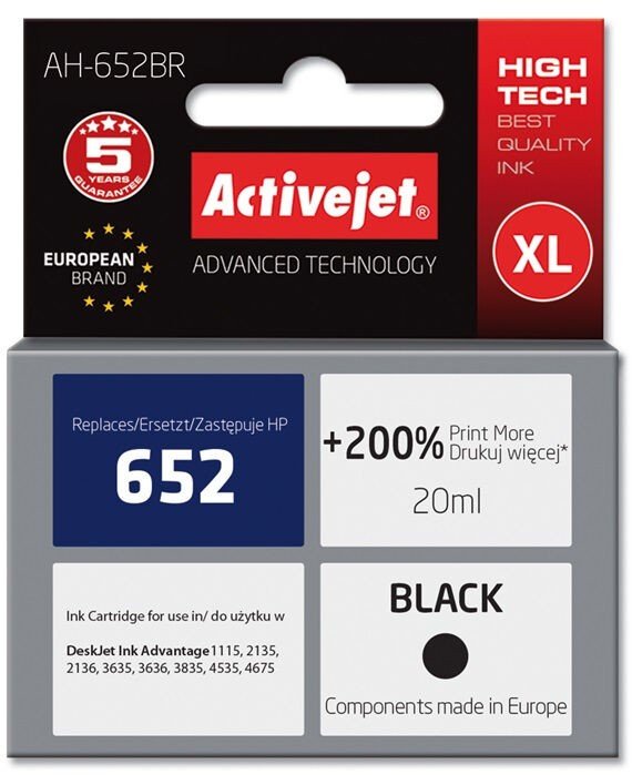 Activejet AH-652BR ink (replacement for HP 652 F6V25AE; Premium; 20 ml; black)