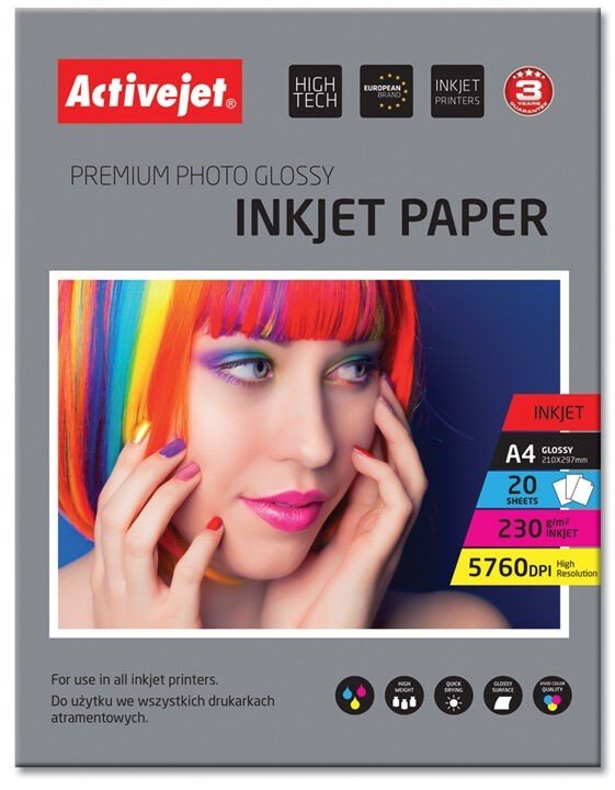 Activejet AP4-180G20 glossy photo paper; for ink printers; A4; 20 pcs Tootekood: AP4-180G20 GTIN: 5901452122539 Consumables | 8,65 € | Poodi | ||