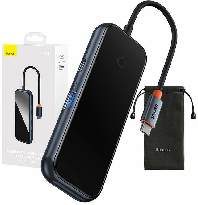 4in1 adapter from Baseus Expand your possibilities with the 4-in-1 adapter from Baseus! The device features 4 USB 3.0 ports, with which you can transfer files at speeds of up to 500 MB. It supports the OTG function, as well as ensuring the safety of use. It also stands out for its wide compatibility, and its stylish and modern design will delight everyone.Transfer files in no time You no longer have to wait indefinitely for your files to be transferred! USB 3.0 ports allow you to transfer files at speeds as fast as 500 MB/s. This allows you to transfer large files, photos, videos or songs between devices in just a few seconds. Even more possibilitiesThe hub will be perfect for any situation - whether at home, at work or on the go. Does your smartphone support OTG? Connect a portable drive to it and conveniently transfer the files or photos you need to your smartphone. Or maybe you want to make it easier to work on your tablet? Just connect a keyboard and mouse to increase the comfort and efficiency of your work. Plug&PlayThe device is equipped with Plug&Play function. What does this mean? It allows you to easily connect your hardware without installing additional software - just plug the built-in cable into the appropriate connector on your computer. Thoughtful designThe small size and weight of the device means you can take it with you anywhere. You'll find a practical case included for easy transport and storage. The light indicator keeps you informed about the working status, and silicone elements prevent the hub from sliding on smooth surfaces. It is made of durable and wear-resistant material, which perfectly dissipates heat from inside the adapter. Also noteworthy is its modern and stylish design.Included4-in-1 adapterprotective caseManufacturerBaseusModelWKJZ010513ColorDark grayMaterialTempered glass + aluminum alloy + PC + ABSCable length140 mmPorts USB 3.0 x4USB 3.0 transfer speed 500 MB/s (Max.)Output 5V / 0.9ACompatibility Windows, Apple OS, Linux, Vista