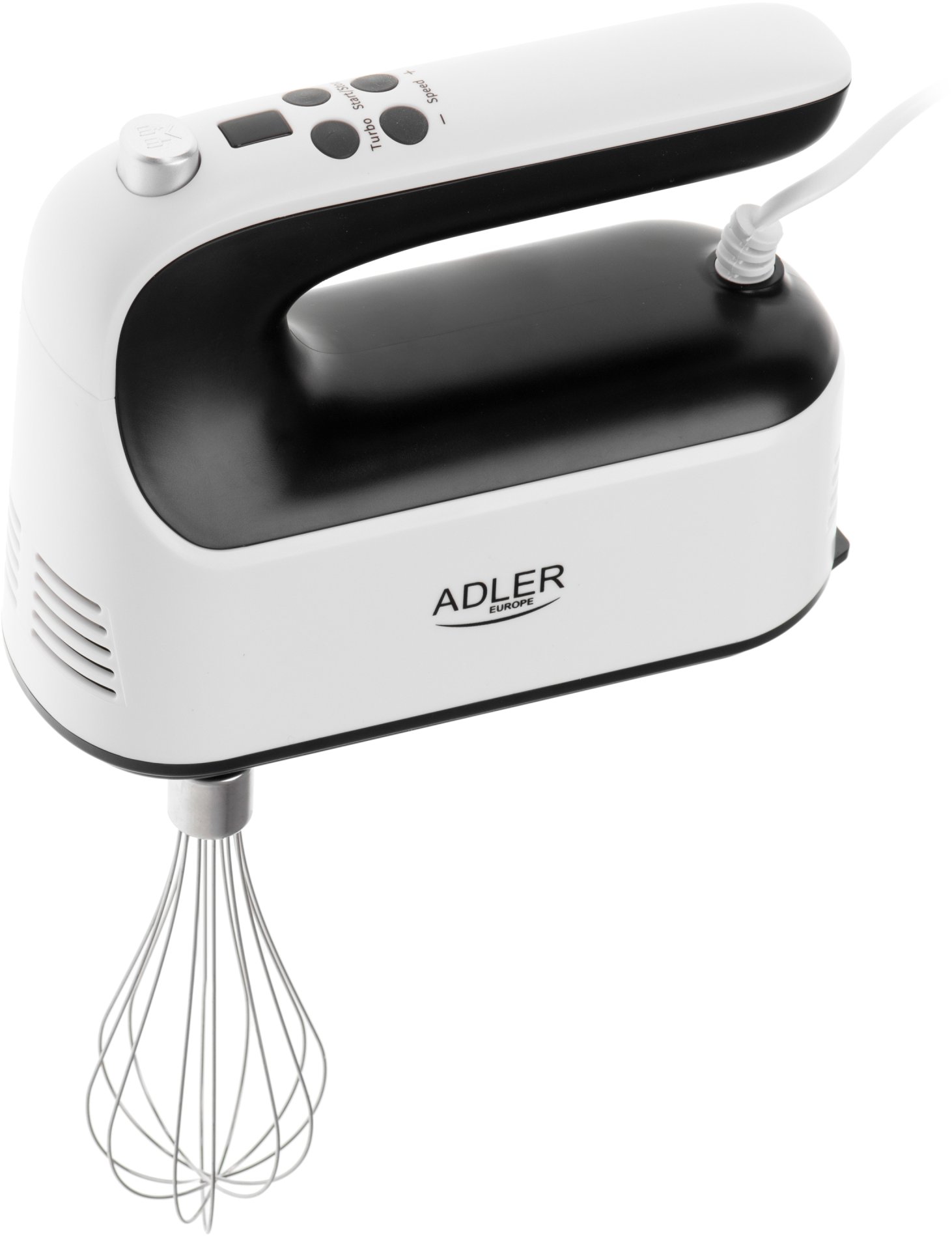 Hand mixer with storage box9 speed control"Turbo" button in pulse modeLCD display showing the selected speedLow attachment rotation on 1st gear3 types of attachments:- 2 flat beaters- 2 dough hooks- 1 whiskAttachments made of SUS 304 stainless steelAttachment length: 19cm"Eject" accessory release buttonDurable construction of beaters, hooks and whiskAccessory container for convenient storagePower cord length: 110cmNominal power: 400WMaximum power: 600WPower supply: 220-240V~ 50-60Hz