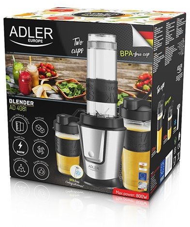 The 1000W AD 4085 cup blender is an efficient device for quickly grinding and mixing food products. It has 2 speed levels, allowing you to blend with different intensity. The blender is equipped with a 4-arm blade made of very durable stainless steel, which perfectly crushes and mixes both soft and hard products. The blades placed in the cup rotate at high speeds, which allows for precise and even fragmentation of products. The jug with a capacity of 1.5l is made of solid AS plastic - does not contain BPA. Thanks to this, you can be sure that the blender will serve you for many years. You can use the Ad 4085 blender to prepare a variety of recipes, such as cocktails, smoothies, soups, sauces and creams. Its ease of use, versatility and efficiency make it an indispensable tool in the preparation of various dishes and drinks. Lightweight jug made of AS plastic – BPA freeJug capacity 1.5 litersStainless steel knife with four bladesPulse function2 speed settings:- I: max 16,000 revolutions per minute- II: max 20,000 revolutions per minuteHousing made of PP plasticLid with removable measuring cupPlastic measuring cup with a maximum capacity of 64mlThe detachable cutting module from the jug makes it easy to cleanNon-slip feetBuilt-in overheat protection fuseDevice dimensions: 15x19x37cmLength of the power cord: 120cmPower: 1000WPower supply: 220-240V ~50/60Hz