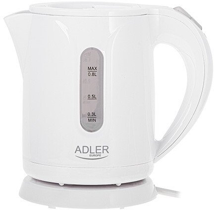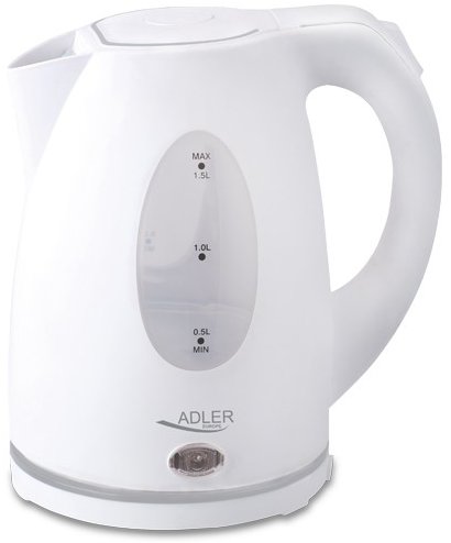 Electric kettle 0,8l AD 1371w white A classic 0.8 litre electric kettle, useful in every kitchen, office and dormitory. Its safety is ensured by a lock that prevents the kettle from being switched on when empty, and an automatic switch off when the water boils. The kettle is equipped with a sediment trap filter to improve the taste and quality of the water. Functionality is enhanced by a stable base and an easy-to-read water level indicator. Very convenient thanks to the flat bottom and swivel base. The kettle boasts an economical power output of 850 watts.