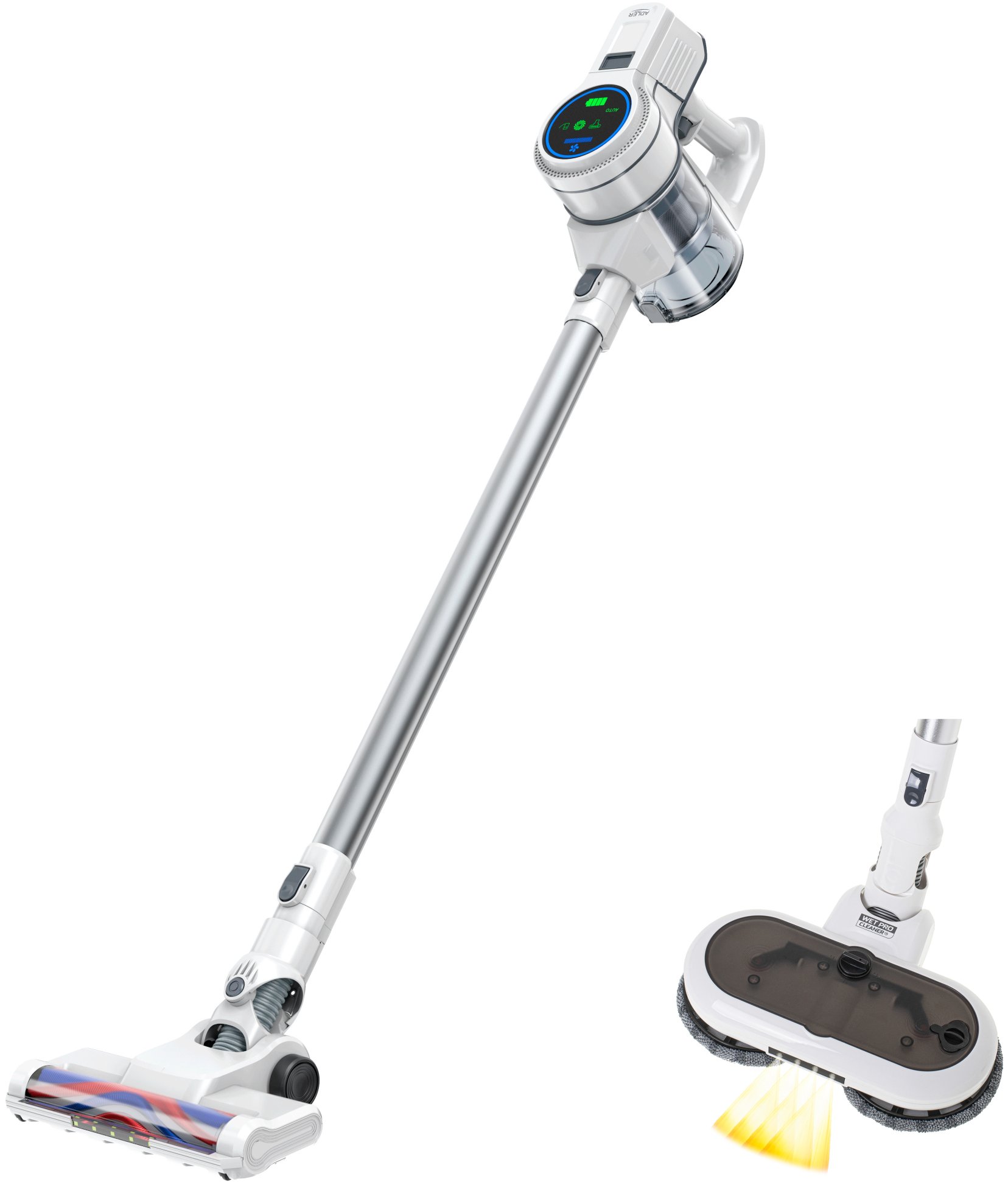Designed for the care of hard floors (stoneware, terracotta, panels, parquet) in a house with an area of up to 150m²Up to 114 minutes of wireless operation using two batteries (second included) 2in1 Dry & Wet flood carry:- for dry hard floor cleaning apply the LED DUST SCANNER ™ electric brush with LED lighting and system for collecting fur and hair from the brush roller, equipped with rubberized wheels to protect the floor- for wet floor cleaning use the WET CLEANER ™ electric mopping brush with LED lighting and 150ml capacity water tankDisplay Type: Touch LEDEfficient brush motorMaximum air flow 14 liters per second3 suction speed levels and AUTO modeAutomatic mode with a dust sensor adjusts the suction power to the degree of dirt on the surfaceSuction power: 4 500 Pa for low power / 7 000 Pa for medium power / 13 000 Pa for highest powerWorking time: 57 minutes for low power / 40 minutes for medium power /15 minutes for top power / 17 minutes for moppingIncluded additional battery allow to double working time to: 114 minutes for low power / 80 minutes for medium power /30 minutes for top power / 34 minutes for moppingTime to fully charge the battery: 4-5 hoursFiltration technology: cyclonic3 stage filtration system:- pre-filter type: stainless steel made- inlet filter type: EPA12- outlet filter type: spongeThe filter HEPA 12 retains 99,5% of impurities with a particle size above 0,5nmTwo filters can be washed, dried and reinstalledRemovable lithium-ion batteryDust container 0.6 liter with one-button easy emptying systemOperating range: unlimited – battery deviceAccessories included:- LED DUST SCANNER ™ electric brush for hard floors- additional roller for the LED DUST SCANNER ™ electric brush, width 21,7cm- WET CLEANER ™ electric mopping brush- additional set of mopping pads – 2 pieces- 2in1 brush for upholstery- crevice nozzle for hard-to-reach places- wall mount for storing the device- accessories hanger- aluminum tube- roller cleaning brushPower: 190WMaximum power: 350WBattery capacity: 2000 mAhBattery voltage: 25.2VPower supply output voltage: 31VPower supply output current: 0.5APower supply input: 220-240V ~50/60HzOverheating protectionBattery overload protectionNoise level: 78dBHousing material: durable ABS plasticDimensions of the device with LED DUST SCANNER™ brush: 105.5x23.7x21.4cmDimensions of the device with the WET CLEANER™ ™ mopping brush: 105.5x28x21.4cmTotal weight: 4,51kg (device, accessories and spare parts)