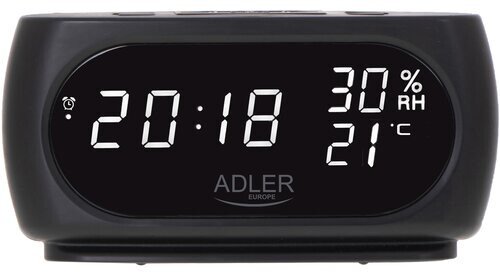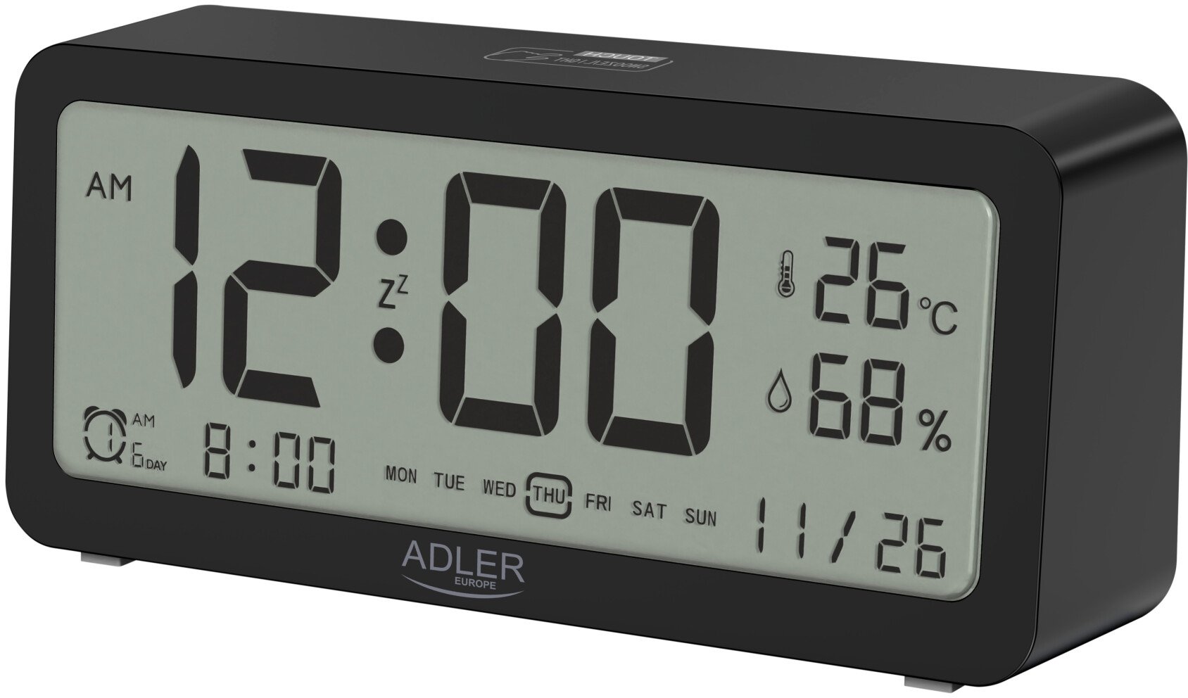 Backlit display; After 4 seconds, the backlight turns off; 3 separate alarm time settings; Displays: time, date, temperature, humidity; Powered by 2xAA batteries