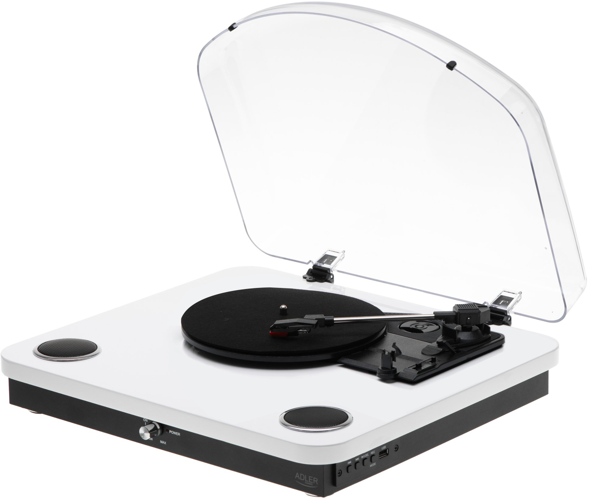 Turntable with USB recording function An elegant turntable that combines the classic sound of vinyl records with modern features such as Bluetooth 5.4 and USB recording. Perfect for music lovers who appreciate both style and functionality. Key Features: Three-speed playback - plays records at 33 1/3, 45, and 75 RPM, allowing you to enjoy your entire vinyl collection.Compatibility with various record sizes - supports 7, 10, and 12 vinyl records.Built-in stereo speakers - 2 x 0.8 W power ensures clear and enjoyable sound.Bluetooth 5.4 playback - stream music wirelessly from your phone, tablet, or laptop.USB recording - digitize your favorite vinyl records and save them directly to a USB drive.High-quality ceramic cartridge - ensures precise sound reproduction and longer lifespan.RCA output - allows connection to external speakers or an audio system.Belt-drive mechanism and automatic tonearm stop - for stable and smooth operation.Included in the set: Anti-slip mat - protects your records and enhances sound quality.45 RPM adapter - enables playback of records in this format. Enjoy your favorite music in analog quality and digitize your collection with innovative features. Technical information:Vinyl record player supports playback at 3 speeds: 33 1/3, 45, 75 rpmSupports 7", 10" and 12" diameter recordsBuilt-in stereo speakers 2 x 0.8 WPlayback via USBHigh quality ceramic cartridgePlayback via Bluetooth version 5.4Recording directly from vinyl to USB flash driveRCA audio outputBelt-driven turntable mechanismAutomatic arm stopIncluded:- Anti-slip mat- 45 rpm adapterPower supply:Power supply input current: 100-240 V~ 50/60 HzPower supply output current: 5 V DC 1 A
