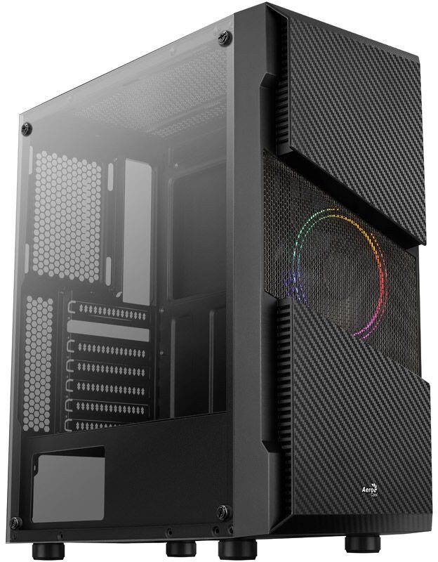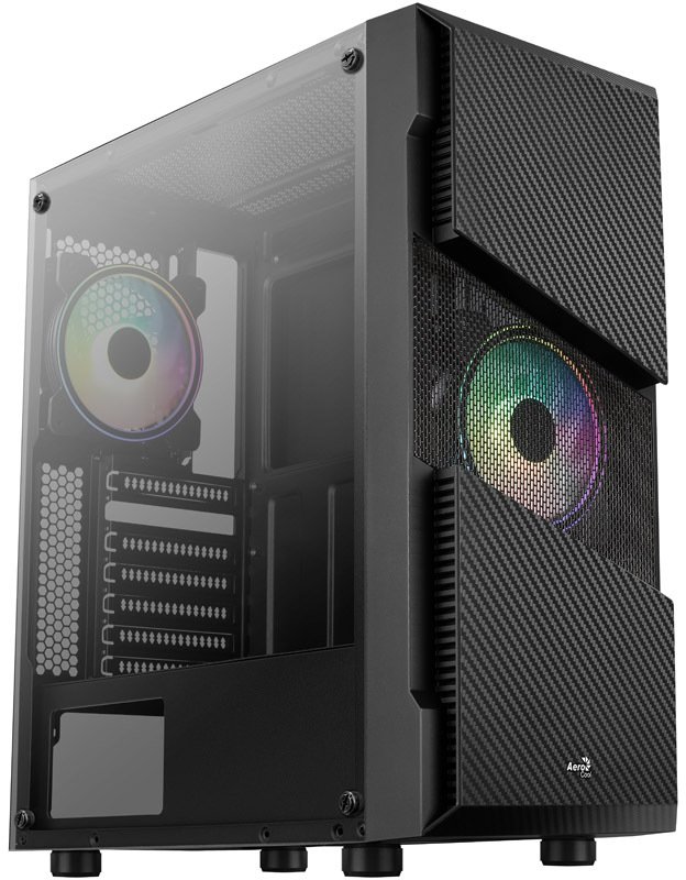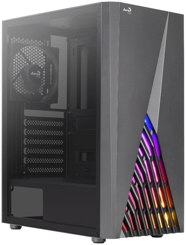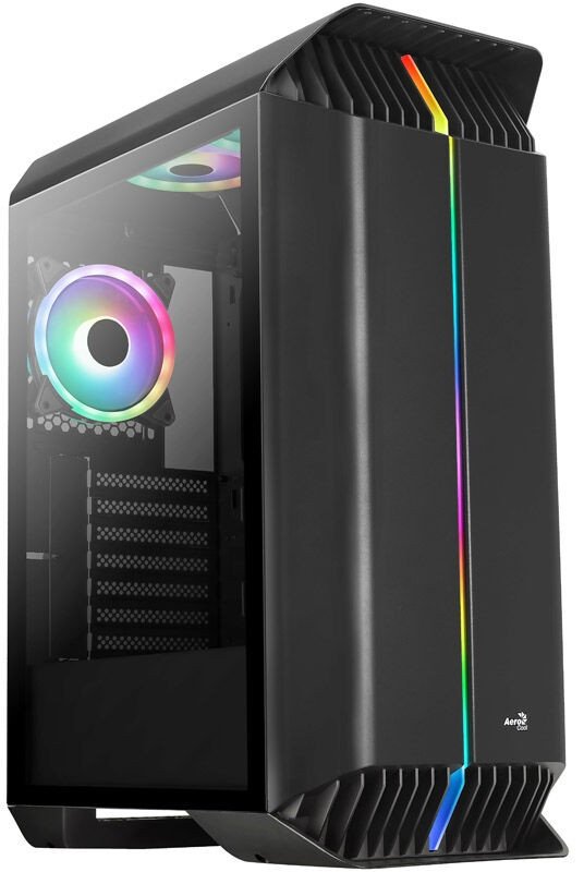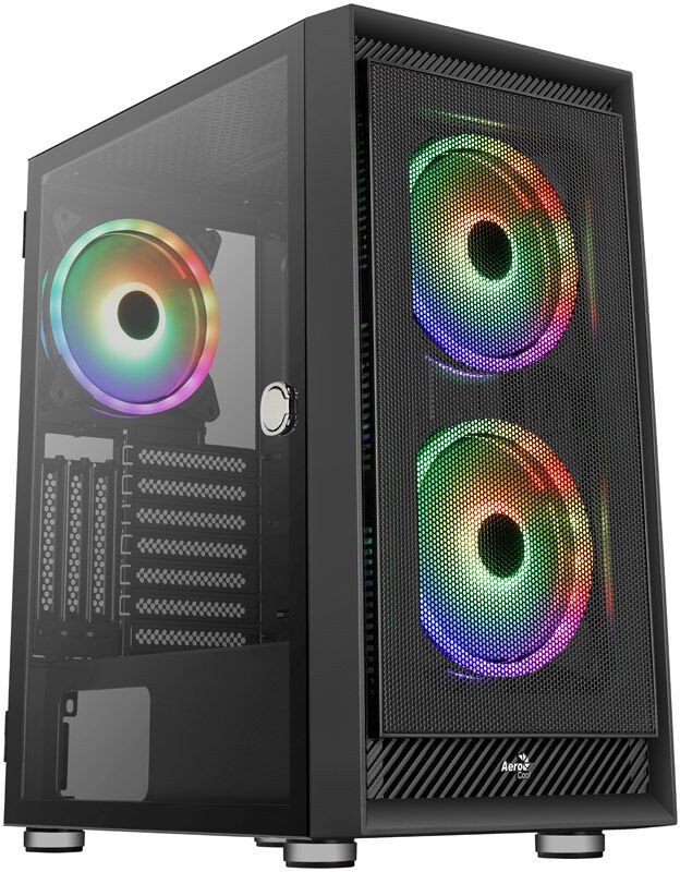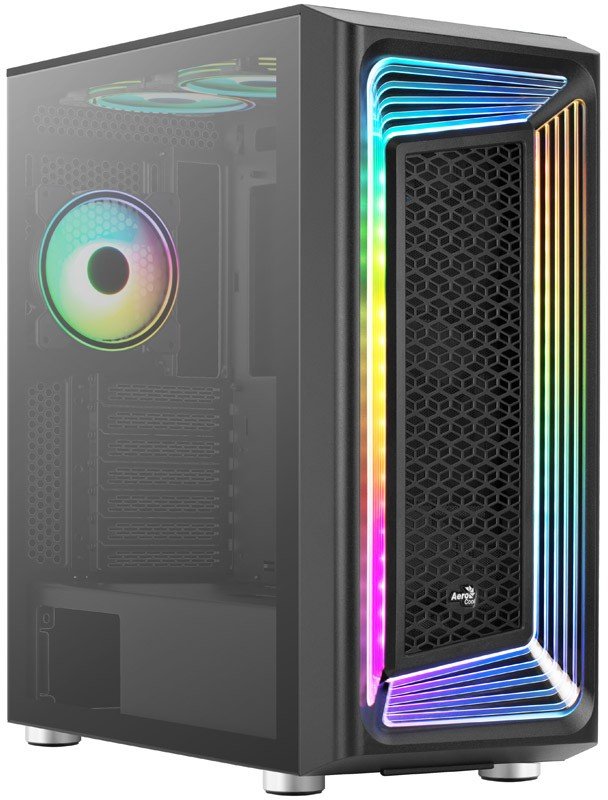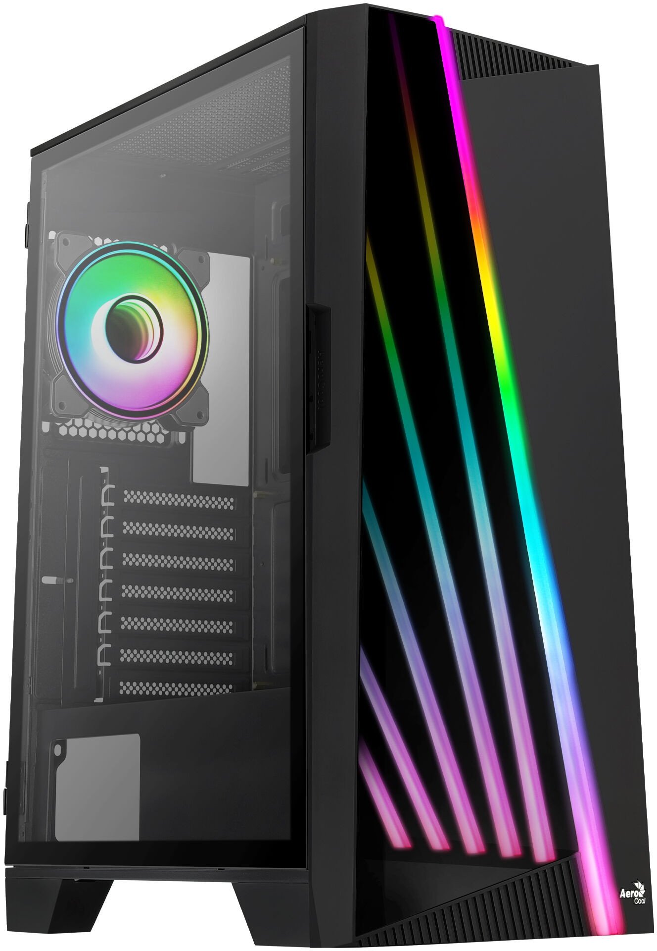 Schwarzer Midi-Tower von Aerocool, mit RGB-LED-Beleuchtung & Hartglas-Seitenteil, bis zu 6x 120-mm-Fans (3x vorinstalliert), Zwei-Kammer-Design, Grafikkarten bis zu 37 cm Länge, 280er / 240er Radiator möglich (Front)