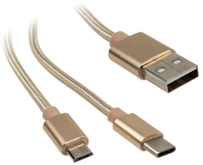 USB-Verbindungskabel von Akasa, USB 2.0 Typ A zu Typ C und Micro-B, 120 cm Länge, goldene Stoffummantelung (Nylonfaser), Steckergehäuse aus Aluminiumlegierung