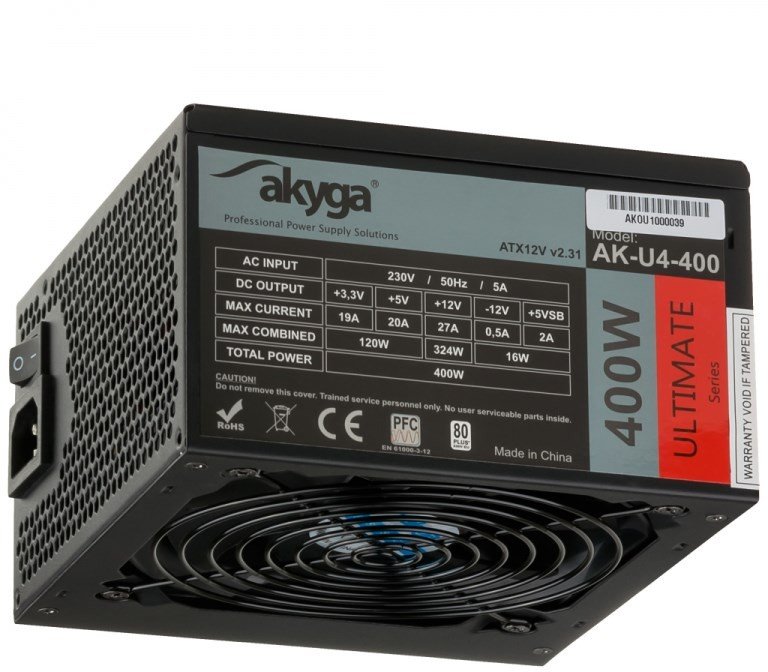 Akyga AK-B1-400 ATX power supply 400W is one of the basic power supplies in our offer dedicated to power desktop computers. Made of high quality components, the power supply has a 3 SATA connectors, 2 MOLEX connectors, P4 4-pin connector and a universal 24-pin motherboard connector. Supports ATX 12V 2.0 specifications, so it can be used with current and next generation of platforms with multi-core processors. Silent 12 cm fan with chromed grill provide efficient cooling. Manual on/off switch allows for safe power cut off without the need of disconnecting the network cord. High efficiency and stable operation of the power supply affects the reliability of all computer components. Several important protectors (OVP, OCP, OPP, OTP, SCP) and PFC filter protect and prevent main computer parts from damage and stabilize the operation of the power supply so that it works without any unwanted interference. Features