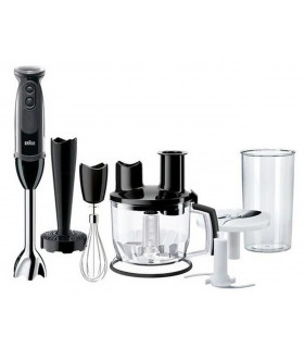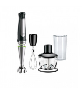 * Multiquick 7 - vaikne DC mootor, värv must plastik / roostevaba * Smart Speed - uuenduslik kiiruseavaliku nupp -suurendage kiirust reguleerimisnupule vajutades * Pritsmevastane roostevabast terasest jalg, ACTIVEBlade tehnoloogiaga ( tera liigub üles alla), POWERBell PLUS (lisa tera) * 600 ml anum, mis sobib suppide ja kastmete valmistamiseks * 500 ml hakkija, mis hakib maitsetaimed 5-sekundiga ning kõva juustu 15-sekundiga * Vispel – munavalgete ja vahukoore vahustamiseks * Võimsus: 1000 W