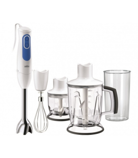 * MultiQuick 3, värv valge/sinine * 2 kiirust, lihtne kiiruse kontroll ühe käega kasutamiseks, * PowerBell tehnoloogia peenemaks ja ühtasemaks tulemuseks * Metall sauaots, vispel * Purustus- ja hakkimisnõu 0,35 l * Kannmikser hakkimis- ja jääpurustamisotsakuga 1,25 l * Mõõdu- ja vahustamisnõu * Võimsus 700 W