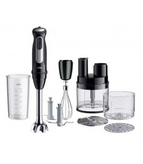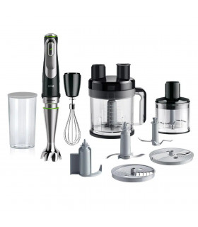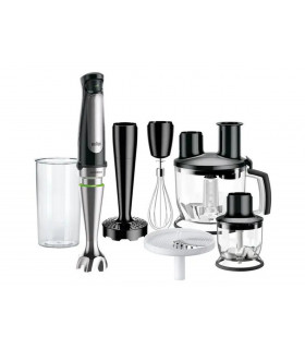 * Multiquick 7 - vaikne DC mootor, värv must plastik / roostevaba * Smart Speed - uuenduslik kiiruseavaliku nupp -suurendage kiirust reguleerimisnupule vajutades * Pritsmevastane roostevabast terasest jalg, ACTIVEBlade tehnoloogiaga ( tera liigub üles alla), POWERBell PLUS (lisa tera) * 600 ml anum, mis sobib suppide ja kastmete valmistamiseks * 500 ml hakkija, mis hakib maitsetaimed 5-sekundiga ning kõva juustu 15-sekundiga * Kannmikser hakkimis- ja jääpurustamisotsakuga 1,25 l * Vispel – munavalgete ja vahukoore vahustamiseks * Võimsus: 1000 W