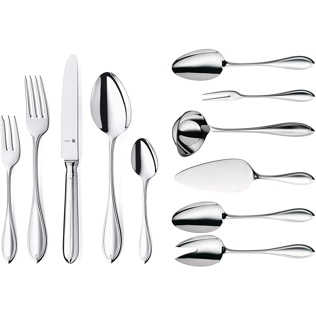 • 66-osaline komplekt 12 inimesele: 12 kahvlit, 12 nuga, 12 lusikat, 12 koogikahvlit, 12 teelusikat, 2-osaline salati serveerimislusikas, 1 serveerimislusikas, 1 portsjonikulp, 1 serveerimiskahvel, 1 koogi serveerimislabidas. • Materjal: Cromargan poleeritud roostevaba teras. • Nõudepesumasinas pestav • Happekindel, hävimatu ja kriimustuskindel • Äärmiselt kriimustuskindel: Hõbenõud püsivad nagu uued aastaid ja ei viita kasutamisjälgedele isegi igapäevasel intensiivsel kasutamisel. WMF Cromargan Protect hõbenõud läbivad patenteeritud protsessi, mis on WMF-is eksklusiivne, et tugevdada vastupidavust kasutamisjälgedele. • Lauanugadel on sisestatud tera, mis on valmistatud spetsiaalsest sepistatud ja karastatud terasest. • Valmistanud WMF - toodetud meie enda WMF-i tehases Heshanis. Kujundus: WMF Atelier (Fred Danner).