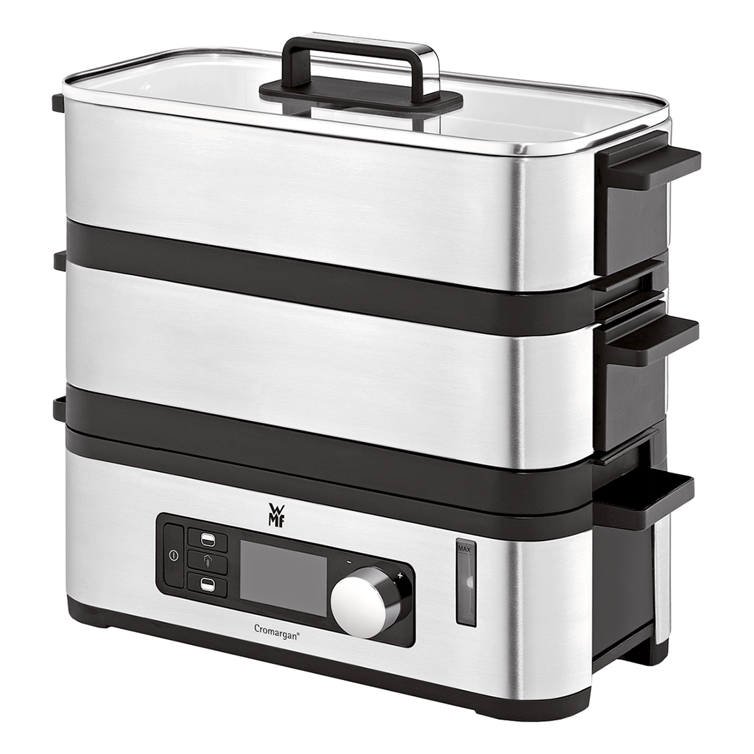 Roostevabast terasest Cromargan® Cromargan on eriline WMFi poolt välja töötatud sulam, mis on kergesti puhastatav ja säilitab oma erilise läike kogu seadme eluaja jooksul. Tänu multifunktsionaalsusele on selle aurutajaga võimalik valmistada erinevaid roogasid nagu riis, pasta, supid jne. Aurutamine on ideaalne variant tervisliku toidu pooldajatele, kuna aurutamisega säilivad toidus mitmed kasulikud vitamiinid. Aurutajal on kaks eraldi toiduvalmistamise ala, et vältida maitsete segunemist. Lisaks on aurutaja sisse seadistatud mitu erinevat eelprogrammi, mälufunktsioon ja LCD ekraan. Veepaak mahutab kuni 1,1 L vett ja seda saab täita väljaspoolt isegi siis, kui aurutaja on parasjagu kasutusel. Veetaseme näidik on läbipaistev Aurutajal on 40 minutiline soojas hoidmise funktsioon Lisaks on kaasas aurutajal veel ka kvaliteetne klaaskaas. Aurutaja mahutavus on 2 x 2,15 L ja mõõtmed K 280 x L 140 x S 275 mm.