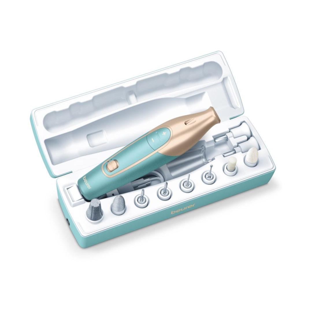 Kaunite käte ja jalgade jaoks. Olenemata sellest, kas lõikad, viilid, kujundad ja poleerid küüsi või eemaldad paksendeid, küünenahka või konnasilmasid – 10 kvaliteetse lisaseadmega saad teha endale maniküüri või pediküüri nagu professionaal. Praktiline hoiukohver toimib ka maniküüriseadme laadimisjaamana ja sobib ideaalselt ka reisimiseks. • Praktilise laadimis- ja hoiukohvriga • Liitiumioonaku 2 tunniks juhtmeta tööks • 10 kvaliteetse küüne- ja nahahoolduse tarvikuga: safiirkoonus, safiiriketas (peen ja jäme), safiirk-paksendite viil, leegikujuline lõikur, silindriline lõikur, viltkoonus, safiirilõikur, küünelõikur, kristall-paksendite viil • 3 kiiruse seadistust kuni 4400 p/min • Ergonoomiline disain ja ere LED-valgus mugavaks kasutamiseks • Hügieeniline töö tänu küünetolmu kaitsekorgile