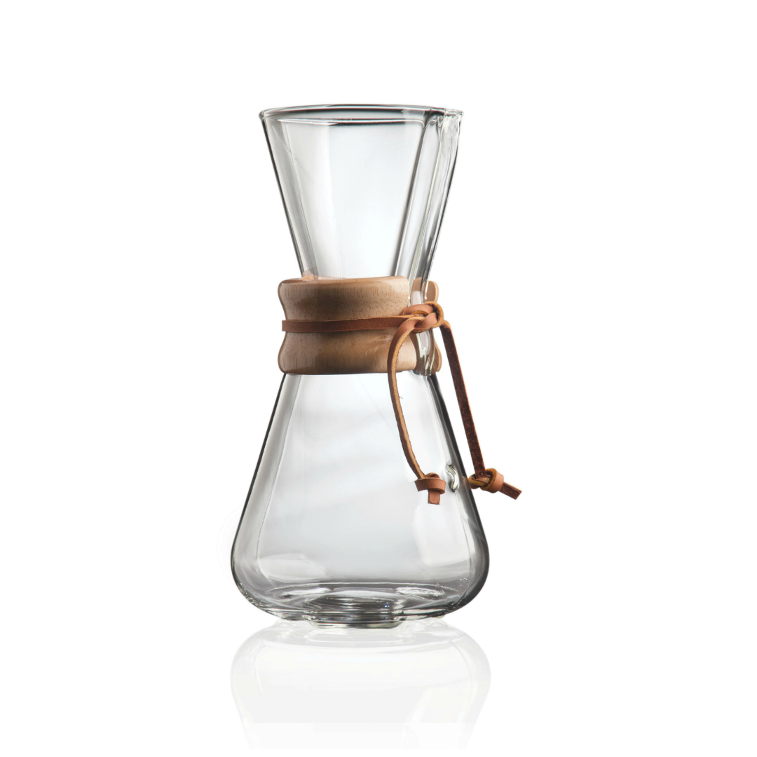 Klaasist kohvivalmistuskann puidust krae ja nahast lipsuga. Lihtne ja elegantne viis kohvivalmistamiseks. Mahutavus: 900 ml Kõrgus: 22 cm Läbimõõt: 13 cm Sobib kokku filtritega: Chemex eelvolditud filtrid (FS-100)