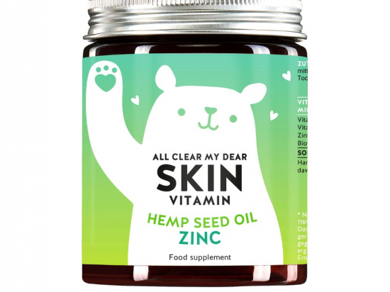 <p>Toime:</p> <ul> <li>Tsink aitab hoida nahka normaalsena.</li> <li>E-vitamiin aitab kaitsta rakke oksüdatiivse stressi eest</li> </ul> <p>Bears With Benefits All Clear My Dear Skin Vitamins on vitamiinide kompleks kummikarude kujul, mis sisaldab 100 mg kanepiõli (millest 50 mg on linoolhape) portsjoni kohta. Lisaks E- ja C-vitamiini.</p> <p>Toode on taimne, suhkruvaba ning sisaldab ainult looduslikku lõhna- ja maitseainet (apelsin).</p>