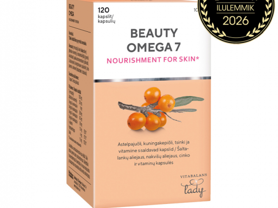 <p>Beauty Omega 7 kapsel sisaldab kombinatsiooni astelpaju viljalihaõli ja kuningakepi õli tervislikest rasvhapetest.</p> <p>Nahka toitev tsink, pantoteenhape (vitamiin B5), A vitamiin ja antioksüdant E vitamiin täiendavad toote ainulaadset koostist.</p> <p>Toitev astelpaju on kuulus oma haruldaste oomega 7 rasvhapete poolest.</p> <p>Kuningakepi õlis on palju oomega 6 rasvhappeid ja gamma-linoolhapet (GLA).</p> <p>Unikaalne astelpajuõli ja kuningakepiõli kombinatsioon koos tsingi, pantoteenhappe ning A-ja E-vitamiiniga sobib eelkõige neile, kellel on kuiv nahk ja limaskestad.</p> <p>Tsink aitab säilitada normaalset nahka ja E-vitamiinil on antioksüdatiivne toime, kaitstes rakke oksüdatiivse stressi eest.</p> <p>A-vitamiinil on oluline roll terve nahakoe ja limaskestade säilitamisel.</p> <p>Laktoosi-, suhkruvaba. Ei sisalda piima-ega sojavalku, magusaineid, toiduvärve.</p> <p><strong>Netokogus: </strong>107,4g (120 kapslit)</p> <p><strong>Tootja: </strong>Vitabalans OY, Soome</p>