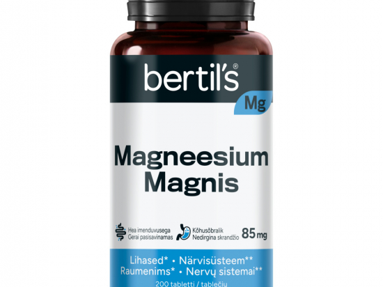 <ul> <li>Aitab kaasa normaalsele energiavahetusele</li> <li>Aitab kaasa normaalsele valgusünteesile</li> <li>Aitab kaasa normaalsetele psühholoogilistele funktsioonidele</li> <li>Aitab hoida luid normaalsena</li> <li>Aitab hoida hambaid normaalsetena</li> </ul> <p>Lisaks aitab magneesium vähendada väsimust ja kurnatust, ning osaleb rakkude jagunemisprotsessis.</p> <p><strong>Netokogus</strong><br /> 100 g<br /> <br /> <strong>Tootja, pakendaja, turustaja</strong><br /> Tootja: Bertil's Health Oy, 68600 Pietarsaari/Jakobstad, Soome</p>