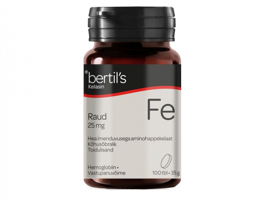 <p>Raud aitab kaasa vere punaliblede ja hemoglobiini normaalsele moodustumisele.<br /> Raud aitab vähendada väsimust ja kurnatust.</p> <p><strong>Netokogus</strong><br /> 35 g<br /> <br /> <strong>Tootja, pakendaja, turustaja</strong><br /> Tootja: Bertil's Health Oy, 68600 Pietarsaari/Jakobstad, Soome</p>
