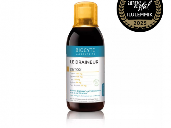 <h3>LE DRAINEUR</h3> <p>Mustsõstramaitseline toidulisand sisaldab võilille, takja, mate tee, hibiskuse, artišoki, nõgese ja kase ekstrakte ning kofeiini (6 mg päevas). Toode toetab organismi normaalset vee tasakaalu ja ainevahetuse protsesse.</p> <p><strong>Koostisosade kirjeldused:</strong></p> <p><strong>Võilille ekstrakt (Taraxacum officinale)</strong><br /> Traditsiooniliselt kasutatakse võilille juurte ja lehtede ekstrakti toetava vahendina. Võilille ekstrakt sisaldab looduslikke antioksüdante ning aitab toetada maksa- ja seedesüsteemi normaalset funktsiooni.</p> <p><strong>Punase viinamarja lehtede ekstrakt (Vitis vinifera)</strong><br /> Sisaldab polüfenoolseid ühendeid, mis toimivad antioksüdantidena ning toetavad vereringesüsteemi ja põletikuvastaseid protsesse.</p> <p><strong>Yerba mate ekstrakt (Ilex paraguariensis)</strong><br /> Sisaldab kofeiini ja antioksüdante, mis võivad aidata säilitada organismi normaalset ainevahetust ja energiat.</p> <p><strong>Hibiskuse ekstrakt (Hibiscus sabdariffa)</strong><br /> Sisaldab polüfenoolseid ühendeid, mis toetavad keha antioksüdantset kaitset ja vereringet.</p> <p><strong>Takja ekstrakt (Arctium lappa)</strong><br /> Traditsiooniliselt kasutatud taimeekstrakt, mis sisaldab antioksüdante ning toetab organismi normaalset ainevahetust ja seedimist.</p> <p><strong>Valge kase ekstrakt (Betula pendula)</strong><br /> Sisaldab bioaktiivseid ühendeid, mis toetavad organismi vee tasakaalu ning omavad antioksüdantset toimet.</p> <p><strong>Artišoki ekstrakt (Cynara scolymus)</strong><br /> Tuntud maksa normaalse funktsiooni toetajana, mis aitab säilitada seedesüsteemi tervist ja ainevahetust.</p> <p><strong>Nõgese ekstrakt (Urtica dioica)</strong><br /> Sisaldab looduslikke koostisosi, mis aitavad toetada organismi normaalset vee tasakaalu ja põletikuvastaseid protsesse.</p> <p><strong>Netokogus:</strong> 500ml</p> <p><strong>Tootja:</strong> Biocyte, 1555 AV de la PLAI, 06250 Mougins, Prantsusmaa.</p> <p><strong>Maaletooja: </strong>UltimateBeauty OÜ, Tartu mnt 84a Tallinn.</p>