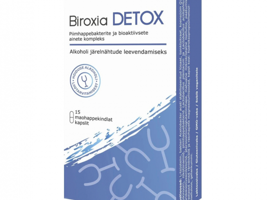 <p>Biroxia Detox on innovatiivne toode, mis sisaldab kasulikke eluvõimelisi baktereid ja erinevaid bioaktiivseid aineid. Toote koostisosad toetavad ja tugevdavad vastastikku üksteise positiivset mõju.</p> <p>Acetobacter aceti stabiliseeritud lüsaat sisaldab aktiivseid ensüüme - alkoholi dehüdrogenaas ja aldehüüdi dehüdrogenaas. Neil ensüümidel on võtmeroll alkoholi jääkproduktide kahjutuks tegemisel.</p> <p>Koensüüm Q10 on tugev antioksüdant.</p> <p>Vitamiin B6 ja niatsiin aitavad kaasa normaalsele energiavahetusele ning aitavad vähendada väsimust ja kurnatust.</p> <p>Tsink kuulub paljude ensüümide, kaasa arvatud alkoholi dehüdrogenaasi koostisse.</p> <p>Alkoholi toimel tekib organismis vitamiin B6, niatsiini, foolhappe ja tsingi puudujääk, mille korvamine on hädavajalik normaalse tervisliku seisundi ja hea enesetunde taastumiseks.</p> <p><strong>Netokogus</strong><br /> 7,5 g (15 kapslit)<br /> <br /> <strong>Tootja, pakendaja, turustaja</strong><br /> Tootja: K2Pharm, Tšehhi Vabariik; KBM Pharma OÜ (Tähtvere 4, 51007 Tartu) tellimusel.<br /> <br /> <strong>Päritoluriik</strong><br /> Tšehhi Vabariik</p>