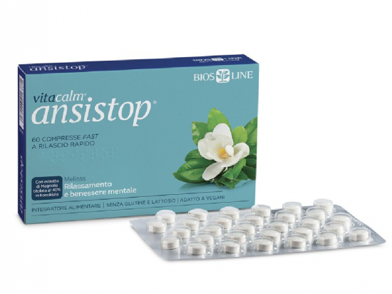 <p>VitaCalm® Ansistop® sisaldab teelehtedest saadud ainet L-teaniini ja magnoolia koore ekstrakti, mis on rikas honokioli poolest. Honokiol on Magnoolia puude koorest, seemnekäbidest ja lehtedest eraldatud lignaan. Melissi ekstrakt ja mandariini eeterlik õli soodustavad lõõgastumist stressi korral.</p> <p>Kiire imendumisega tabletid on valmistatud spetsiaalse tehnoloogiaga, mis võimaldab aktiivainetel imenduda ja tablettidel mõjuda juba 5 min peale manustamist. </p> <p>Gluteenivaba, laktoosivaba.</p> <p><strong>Netokogus: </strong>24g<br /> <strong>Tootja:</strong> Bios Line S.p.A, Viale Finlandia 4, 35020 Ponte San Nicolò - Padova, Itaalia</p>