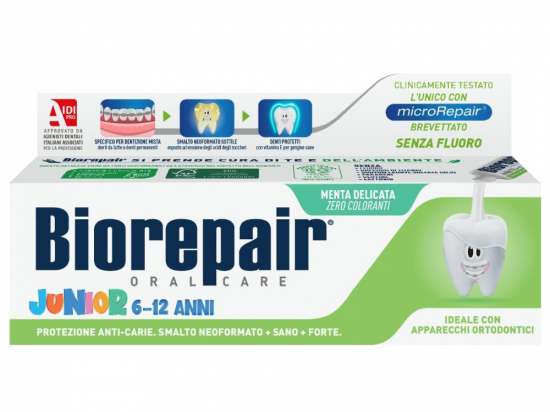 <p>Biorepair Junior on ainus laste hambapasta, mis sisaldab hambaaukude tekke vastu võitlevat ja hambaemaili tugevdavat microRepair®-i, mille koostis ja struktuur sarnanevad hammaste omadega.</p> <ul> <li>tungib ka kõige väiksematesse pragudesse</li> <li>kinnitub hambaemaili struktuuri külge</li> <li>taastab emaili ning hoiab ära kaariese tekke.</li> </ul> <p>Tootes sisalduv E-vitamiin tugevdab ja varustab igemeid toitainetega, õrn piparmündi maitse tagab kauakestva värske hingeõhu.</p>