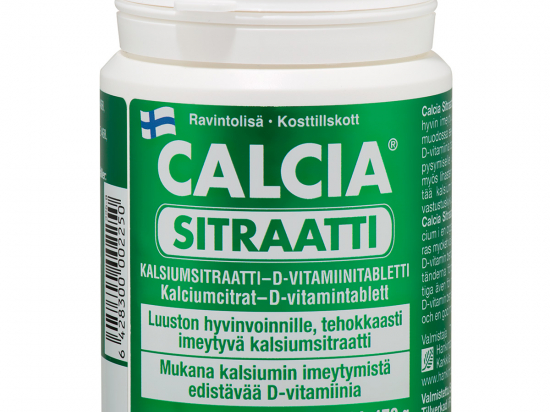 <p>Toidulisand Calcia Sitraatti sisaldab hästiimenduvat orgaanilist kaltsiumi tsitraadi vormis ning D3-vitamiini. Kaltsium ja D-vitamiin on vajalikud, et hoida luid ja hambaid ning lihaste tööd normaalsetena. D-vitamiin aitab kaasa kaltsiumi normaalsele imendumisele ning immuunsüsteemi normaalsele talitlusele.</p> <p>Kaltsium on oluline mineraalaine inimese organismis, kuna sellest sõltub luude ja hammaste tugevus. Samuti osaleb kaltsium närvirakkude ja lihasrakkude (sh südamelihase) töös ning aitab kaasa normaalsele vere hüübimisele.</p> <p><strong>Netokogus:</strong> 179 g / 160tabletti</p> <p><strong>Tootja: </strong>Hankintatukku, Soome</p>