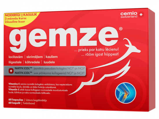 <p><strong>Cemio GEMZE® </strong>sisaldab uue põlvkonna kollageene NCI® ja NCII®. Tänu spetsiaalsetele töötlemistehnoloogiatele säilitab kollageen NATIV.COL™ oma esialgse kolmikheeliksi struktuuri ja bioloogilise aktiivsuse.</p> <ul> <li>I tüübi kollageeni leidub sidemetes ja kõõlustes. See kollageen on orgaanilise luu põhiosa. I tüübi kollageen moodustab 90 % kõigist organismis leiduvatest kollageenidest. Ainet on leitud ka nahas.</li> <li>II tüübi kollageen leidub põhiliselt kõhredes ja liigestes. Moodustab 70 % kõhre kuivmassist.</li> <li>Vitamiin C aitab kaasa kollageeni normaalsele moodustumisele luude, kõhrkoe ja naha normaalseks talitluseks.</li> </ul> <p>Väikesed pehmed ülilihtsalt manustatavad želatiinkapslid.<br /> Põhiliste koostisosade päritolumaa erineb toote päritolumaast.</p> <p><strong>Netokogus </strong>27g (60 kapslit)</p> <p><strong>Tootja esindaja EL-s (turustaja): </strong>CEMIO Switzerland s. r. o., Tomíčkova 2144/1, 148 00 Praha 4, Tšehhi.</p> <p><strong>Päritoluriik: </strong>Šveits</p>