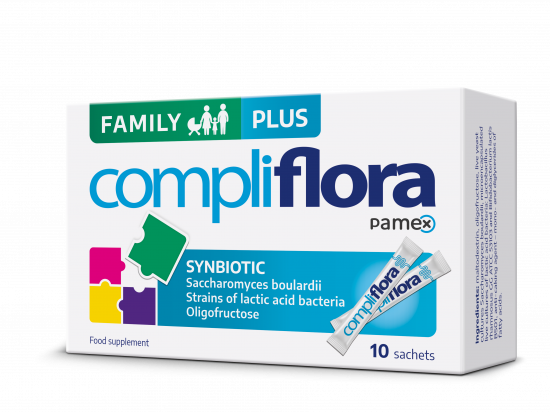 Compliflora Family Plus pulber N10 Tootekood: 7001617 GTIN: 4260312160052 Probiootikumid <p>Toidulisand piimhappebakterite ja pärmiseene eluskultuuride ning oligofruktoosiga.</p> <p>Compliflora family+ on imikutele, lastele ja täiskasvanutele mõeldud sünbiootikum (probiootikum koos prebiootikumiga).</p> <p>Seedetraktile oluline pärmiseen Saccharomyces boulardii ja mikrokapseldatud piimhappebakterite tüved koloniseeruvad peensooles (Lactobacillus rhamnosus GG) ja jämesooles (Bifidobacterium lactis). Spetsiaalse patenteeritud mikrokapseldamise tehnoloogia abil tagatakse, et piimhappebakterid jäävad ellu mao happelises keskkonnas ja jõuavad elujõulisena seedekulglasse, kus nende tõhus toime mõjule pääseb.</p> <p>Toode sisaldab lisaks oligofruktoosi, mis on energiaallikas piimhappebakteritele, soodustades nende paljunemist ja aktiivsust.</p> <p>Ei sisalda sünteetilisi toiduvärve, säilitusaineid ega lõhna- ja maitseaineid. Laktoosi- ja gluteenivaba.</p> <p><strong>Netokogus:</strong> 24 g (10 pakikest x 2,4g).</p> <p><strong>Tootja:</strong> Pamex Pharmaceuticals GmbH, In der Stelzbach 1, 65618 Selters, Saksamaa.</p> <p><strong>Turustaja Eestis:</strong> Sirowa Tallinn AS, Salve 2c, 11612 Tallinn. </p> | out of stock | 5,89 € | Poodi | |