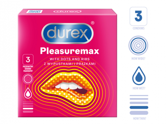 Durex Pleasuremax kondoomid N10 Tootekood: 7015246 GTIN: 5900627117707 Kondoomid ja paiksed rasedusvastased vahendid <p>Läbipaistvad standardpaksusega looduslikust latekskummst kondoomid.</p> <p>Nominaallaius: 56 mm.</p> <p>Ribide ja täppidega stimulatsiooniks.</p> <p>Kergesti paigaldatav, nibukujulise otsaga, lisa libestusainega.</p> | in stock | 13,26 € | Poodi | |