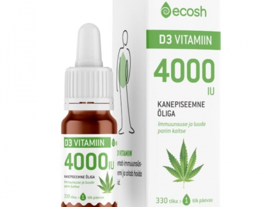 Ecosh D3-vitamiini tilgad kanepiõliga 4000IU 10 ml Tootekood: 474160954155 GTIN: 4741609541551 Muud tooted organismi tugevdamiseks <p>D3-vitamiin on vajalik vitamiin sügis-talvisel perioodil, eriti päikesevaesele Põhja-Euroopa rahvastikule. </p> <p>D3 vitamiin toetab immuunsüsteemi, luude ja hammaste ehitust ning närvisüsteemi ja ainevahetuse normaalset talitlust.</p> <p>Eestis toodetud D3-vitamiin on valmistatud kanepiseemneõli baasil. Vitamiin D3 (kolekaltsiferool) pärineb lambavillast toodetud lanoliinist. Vedelal kujul D3-vitamiin on villitud pipetiga varustatud klaaspudelisse.</p> <p><strong>Netokogus </strong>330 tilka, 10ml</p> <p><strong>Tootja:</strong> Ecosh Life OÜ, Kukermiidi 4, 11216 Tallinn, Harjumaa, Eesti</p> | in stock | 11,32 € | Poodi | |