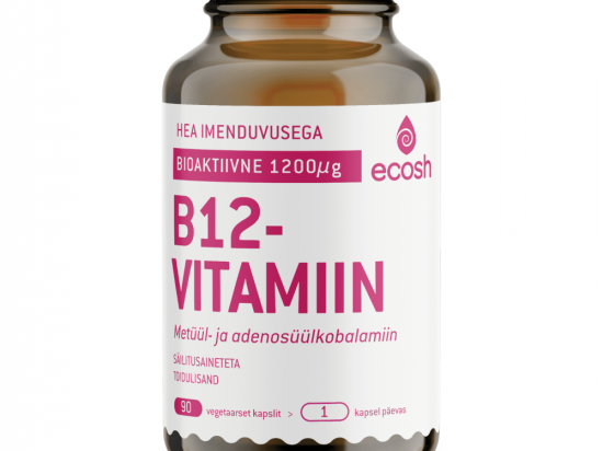 Ecosh B12 Vitamiin bioaktiivne N90 Tootekood: 474987654271 GTIN: 4749876542714 B12 vitamiin <p><strong>Ecoshi Bioaktiivse B12 vitamiini</strong> sisalduses on metüülkobalamiin ja desoksüadenosüülkobalamiin. Tegu on tugevatoimelise ja aktiivse B12 toidulisandiga, mis koosneb kvaliteetsetest koostisainetest. </p> <p>Vitamiin B12 aitab kaasa normaalsele energiavahetusele, närvisüsteemi ja immuunsüsteemi normaalsele talitlusele, homotsüsteiini normaalsele ainevahetusele, verepunaliblede moodustumisele ning lisaks aitab vähendada väsimust ja kurnatust.</p> <p>90 taimset kapslit</p> <p>Netokogus 60g</p> <p>Tootja: Ecosh Life OÜ</p> <p>Päritoluriik Eesti</p> | in stock | 9,79 € | Poodi | |