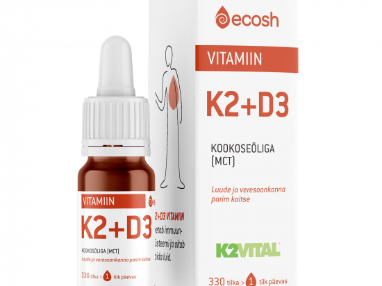 Ecosh K2+D3 vitamiini tilgad 10 ml Tootekood: 474160954185 GTIN: 4749876541854 Muud tooted organismi tugevdamiseks <p>Vitamiinide K2 ja D3 sisaldus organismis mängivad tervise seisukohast äärmiselt tähtsat rolli. K2 vitamiin aitab kaasa vere normaalsele hüübimisele. Vitamiin D aitab kaasa immuunsüsteemi normaalsele talitlusele ja hoida luid, hambaid ja lihaste talitlust normaalsena. </p> <p>Looduslikult esineb vitamiin K kahes vormis, milleks on K1 ehk füllokinoon ja K2 ehk menakinoon. Esimest sünteesitakse taimede abil ning teist bakterite kaudu. Tegu on rasvlahustuva vitamiiniga. </p> <p>NB! K-vitamiini vormidest püsib kehas kõige pikemat aega K2 MK7 kuni 72h võrreldes K1 ja K2 MK 4-ga, mis püsivad keha vaid 1,5h. </p> <p><strong>Netokogus: </strong>10ml, ligikaudu 330 tilka</p> <p><strong>Tootja:</strong> Ecosh Life OÜ, Kukermiidi 4, 11216 Tallinn, Harjumaa, Eesti</p> | in stock | 25,52 € | Poodi | |