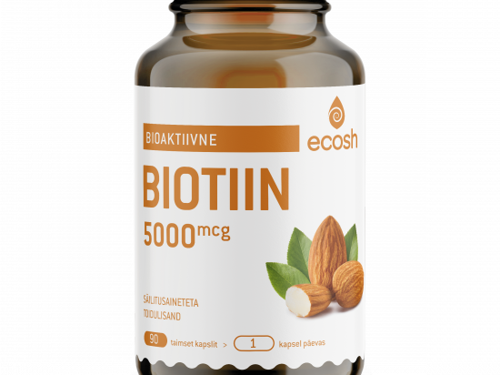 Ecosh Biotiin N90 Tootekood: 7010142 GTIN: 4741609542763 Universaalsed tooted nahale, juustele ja küüntele <ul> </ul> <p>-vitamiinide hulka kuuluv tugevatoimeline bioaktiivne D-biotiin, tuntud ka H-vitamiini, B7 ja koensüüm R nime all, osaleb koos teiste sama rühma vitamiinidega toidu energiaks muutmisel.</p> <p>Ilu vitamiinina on biotiinil tähtis roll naha, juuste ja küünte tervisele, kuna on üks tähtsamaid vitamiine rakkude kasvamise ja uuenemise tagamisel. Biotiin aitab kaasa makrotoitainete ainevahetusele, normaalsele energiavahetusele ja närvisüsteemi talitlusele. Paljude erinevate ülesannete kõrval aitab biotiin hoida ka limaskesti normaalsena ning toetab psühholoogilisi funktsioone.</p> <p><strong>Mida tähendab bioaktiive?</strong> Bioaktiivne aine on koheselt valmis minema biokeemiliste muundumiste ehk ainevahetuse võrgustikku, mis on organismide elu aluseks. Mitteaktiivsed vitamiinid tuleb rakus esmalt muuta aktiivseks, kuid bioaktiivne vitamiin on koensüümses vormis ja ei nõua enam rakus lisa reaktsioone. See omakorda hoiab kokku organismi ressursse nagu energiat ja organismile olulisi toitaineid.</p> <p>Toode on laktoosi- ja gluteenivaba.</p> <p><strong>Netokogus: </strong>90 kapslit, 67 g</p> <p><strong>Tootja:</strong> Ecosh Life OÜ, Kukermiidi 4, 11216 Tallinn, Harjumaa, Eesti</p> | in stock | 12,02 € | Poodi | |
