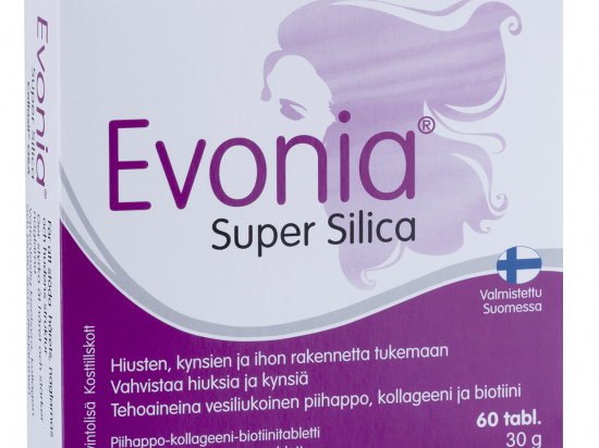 <p>Toimeaineteks veeslahustuv ränihape, kollageen ja biotiin</p> <p>Evonia® Super Silica on ainulaadne toidulisand, mis sisaldab veeslahustuvat räni, hüdrolüüsitud kalakollageeni ja biotiini. Need toimeained toetavad juuste, küünte ja naha struktuuri ja vastupidavust.</p> <p>Collasil® OSA-s sisalduv räni on bioloogiliselt aktiivses veeslahustuvas ränihappe vormis seotuna biotiiniga. Collasil® OSA tugevdab juuste ja küünte struktuuri ning vähendab nende katkemist pesemisel ja kammimisel. Collasil® OSA aitab säilitada naha elastsust ja niiskustasakaalu ning tugevdab küünte struktuuri. Biotiin aitab hoida juukseid ja nahka normaalsena.</p> <p><strong>Netokogus: </strong>60 tabletti (30g)</p> <p><strong>Tootja</strong>: Hankintatukku OY, Karkkila, Soome.</p> <p><strong>Esindaja:</strong> OÜ Loodustoode Rabaküla 4/2, Tallinn, tel: 6660091</p>