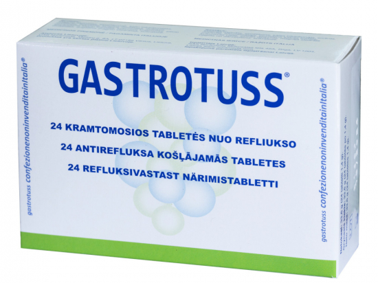 <p>Gastrotuss® tabletid aitavad kaasa gastroösofageaalse ja/või larüngofarüngeaalse limaskesta re-epitelisatsiooni protsessidele. Gastrotuss® tabletid vähendavad maosisu maos püsimise aega. </p> <p><strong>Hoiatused ja ettevaatusabinõud:</strong></p> <ul> <li>Ärge kasutage seda toodet, kui teil esineb ülitundlikkus mis tahes koostisosa suhtes;</li> <li>Kui te olete rase või imetate, rääkige enne toote kasutamist oma arstiga;</li> <li>Kõrvaltoime tekkimisel, katkestage kasutamine ja pidage nõu oma arstiga;</li> <li>Mitte ületada soovitatud annuseid, järgida juhiseid;</li> <li>Gastrotuss® tablette on soovitatud võtta vähemalt 1 tund enne või pärast teiste ravimite võtmist;</li> <li>Ärge kasutage toodet, kui originaalpakend on vigastatud;</li> <li>Ärge kasutage seda toodet pärast kõlblikkusaega, mis on märgitud pakendil.</li> <li>Kõlblikkusaeg viitab tervele ja nõuetekohaselt säilitatud tootele;</li> <li>Hoida laste ees varjatud ja kättesaamatus kohas;</li> <li>Hoida temperatuuril kuni 30 °C.</li> </ul> <p><strong>Tootja:</strong> DMG Italia srl, Via Laurentina, km 26,700 00071 Pomezia, Rome, Itaalia<br /> <strong>Maaletooja:</strong> UAB Norameda Eesti filiaal, Akadeemia tee 21/3, 12618 Tallinn<br /> <strong>Pärioluriik:</strong> Itaalia</p>