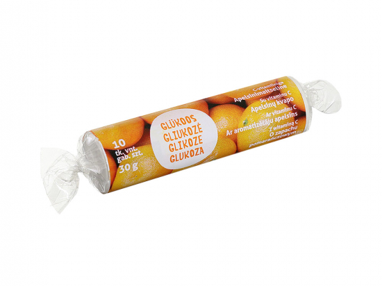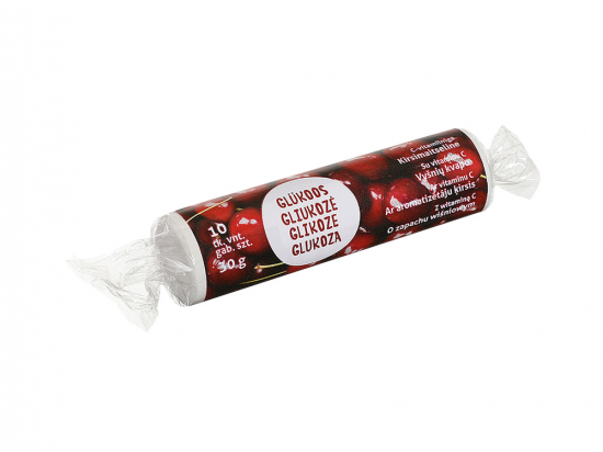 <p>GLÜKOOS C-VITAMIINIGA KIRSIMAITSELINE. Toidulisand. Neto kogus: 30 g. 10 tabletti.</p> <p>Koostisosad: glükoos (98%), vitamiin C (L-askorbiinhape) (0,83%), paakumisvastane aine rasvhapete magneesiumsoolad, päevalilleõli, happesuse regulaator sidrunhape, lõhna- ja maitseaine (kirss).</p> <p>1 tablett sisaldab 25 mg C-vitamiini (31,3 % NRV*), 5 tabletti sisaldab 125 mg C-vitamiini (156,3 % NRV*). *NRV – päevane võrdluskogus. Annustamine: täiskasvanutele närida 1-5 tabletti päevas, lastele 1-3 tabletti päevas. Mitte ületada päevast ettenähtud annust. Toidulisand ei asenda mitmekülgset ja tasakaalustatud toitumist ega tervislikku eluviisi. Säilitada kuivas, pimedas, lastele kättesaamatus kohas, temperatuuril kuni 25 °C.</p> <p>Ražots ES pēc / Toodetud EL-is ettevõttele UAB ""EVD Baltija“, Ozo g. 25, LT-07150 Vilnius, Lietuva / Leedu pasūtījuma.</p>