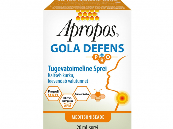 <p>Tänu „mukoadhesiivsetest polümeersetest aktiivainetest“ koosnevale APM kaitsekompleksile tekitab Apropos Gola Defens PRO alkoholivaba sprei kaitsva toimega mukoadhesiivse kile, mis kaitseb orofarüngeaalset limaskesta kahjulike välistegurite eest, niisutades seda ja avaldades rahustavat mõju.</p> <p>Tänu kilet moodustavale toimele ja Propoli M.E.D.® sisaldusele kaitseb Apropos Gola Defens alkoholivaba sprei kurku välistegurite eest, leevendades kurguärritusega seotud valutunnet, mis on tüüpiline farüngiidi ja tonsilliidi korral.<br /> Toode on alkoholivaba, mistõttu see sobib kasutamiseks ka lastel.</p> <p><strong>Seadme ja pakendi sisu</strong><br /> Pihustiga pudel; 20 ml sprei<br /> <br /> <strong>Tootja või tootja volitatud esindaja</strong><br /> Tootja: DESA PHARMA srl, Via Montello 26 – 20831 Seregno MB (Italy)<br /> Levitaja: Allium UPI OÜ, Laagri Ärimaja, Laagri 76401, Harjumaa, Eesti<br /> <br /> <strong>Päritoluriik</strong><br /> Itaalia</p>