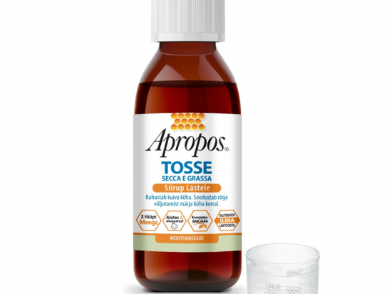 <p>Apropos Tosse Secca e Grassa kuiva ja märja köha köhasiirup lastele koosneb polüsahhariidirikastest looduslikest jahubanaani ja Islandi sambliku ekstraktidest, mis tekitavad kompleksbarjääri ehk mukoadhesiivse kaitsva kile kaitsmaks suu limaskesta, niisutades seda ja leevendades ärritust ning kaitstes samas ka hingamisteid, piirates kokkupuudet väliste nakkusetekitajate ja ärritavate ainetega.</p> <p>Kaitsebarjääri efekti võimendab ka kahte tüüpi mee sisaldus: lillemesi ja eukalüptimesi, mis hingamisteid kaitstes soodustavad ärritunud limaskesta mikrokahjustuste iseenesest paranemist.</p> <p>Sobib nii kuiva kui ka märja köha korral, rahustab köha, leevendab ärritust ja soodustab bronhide sekretsioonide voolavust, hõlbustades röga väljutamist. Lisaks muudavad mesi ja puuviljane maitse Apropos Tosse köhasiirupi meeldivaks eriti just lastele. Sobib üle 1-aastastele lastele.</p> <p><strong>Seadme ja pakendi sisu</strong><br /> 1 pudel: 150 ml koos mõõtekorgiga. Mõõtekork sisaldub pakendis<br /> <br /> <strong>Tootja või tootja volitatud esindaja</strong><br /> Tootja: DESA PHARMA srl, Via Montello 26 – 20831 Seregno MB (Italy)<br /> Levitaja: Allium UPI OÜ, Laagri Ärimaja, Laagri 76401, Harjumaa, Eesti<br /> <br /> <strong>Päritoluriik</strong><br /> Itaalia</p>
