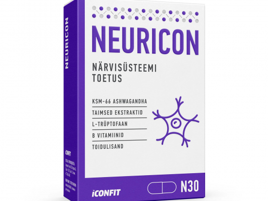 ICONFIT Neuricon - närvisüsteemi toetuseks N30 Tootekood: 474413001486 GTIN: 4744130014860 Närvisüsteem ja uni <p>Toidulisand Neuricon on loodud toetamaks närvisüsteemi ning leevendamaks stressi ja pinget, pakkudes ühtlasi rahu ja tasakaalu. Sisaldab looduslikke koostisosade segu, mis toimetavad süvitsi ja aitavad teil säilitada meelerahu.</p> <ul> <li> <p><strong>KSM-66 Ashwagandha</strong> mõjutab <strong>südant ja kardiovaskulaarsüsteemi</strong>, omab <strong>adaptogeenseid omadusi</strong>, toetab <strong>vaimset tervist ja lõõgastumist</strong>. Toetab ka õppimist, mälu ja mäletamist. Aitab taastuda stressirohketest sündmustest.</p> </li> <li> <p><strong>L-Trüptofaan</strong> on serotoniini eelkäija, meeleolu reguleerimisega seotud neurotransmitter.</p> </li> <li> <p><strong>Sidrunmeliss</strong> aitab säilitada <strong>positiivset meeleolu</strong> ja <strong>head </strong><strong>kognitiivset võimekust</strong>, toetades ka lõõgastumist ning vaimset ja füüsilist heaolu.</p> </li> <li> <p><strong>Punakas kannatuslill</strong> toetab <strong>vaimset aktiivsust</strong> ülekoormuse ja stressi tingimustes.</p> </li> <li> <p><strong>Naistepuna</strong> aitab <strong>säilitada </strong><strong>emotsionaalset tasakaalu</strong> ja <strong>positiivset meeleolu</strong>.</p> </li> <li> <p><strong>C-vitamiin </strong>ja<strong> B-vitamiinide kompleks (B1, B2, B3, B5, B6, B7, B12).</strong> aitavad kaasa <strong>närvisüsteemi </strong>normaalsele toimimisele.</p> </li> <li> <p><strong>Pantoteenhape</strong> aitab kaasa normaalsele vaimsele jõudlusele.</p> </li> <li> <p>Karbis on kogus kuuks ajaks</p> </li> </ul> <p><strong>Netokogus: </strong>30 kapslit, netokaal 16,5 g.<strong> </strong></p> <p><strong>Tootja: </strong>European Foods OÜ, Härgmäe 22, Tallinn, 13525, Harjumaa, Estonia</p> | out of stock | 8,07 € +1,61 € | Poodi | |