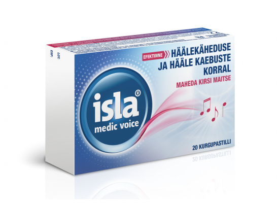 <p><span><span>ISLA MEDIC VOICE PASTILLID N20</span></span><br /> <br /> Näidustused: valulik kurk ja kurgukähedus, ärritusköha, kuiv köha, häälepaelte ärritus, häälekähedus, lisaniisutus tugevalt kurnatud ja pikaajalise koormuse all olevatele häälepaeltele (nt. lauljad, näitlejad, pedagoogid), limaskestade kuivusest tingitud neelamis- ning rääkimisraskused, külmetuse sümptomite korral.<br /> <br /> <span><span>ISLA MEDIC VOICE </span></span>imemistablette imedes ühineb koostises olev hüdrogeelkompleks hüaluroonhappe ning islandi samblikust saadud unikaalse ekstraktiga.</p> <p>Tulemuseks on kurgu ja suu limaskestadele tugevasti kinnituv hüdrogeel, mis moodustab efektiivselt niisutava kaitsekihi.</p> <p>KAITSE: Hüdrogeelkompleks koosneb karbomeerist ja ksantaankummist. Seoses ksantaankummi tugevale veesidumisvõimele ja karbomeeri spetsiaalsele geeli moodustavale omadusele, tekib ärritunud kurgu ja suu limaskestadele kauapüsiv hüdrogeeli kaitsekiht.</p> <p>NIISUTUS: Vedelikku siduva ja imava omadusega hüaluroonhape ja islandi samblikust saadud ekstrakt niisutavad intensiivselt limaskesti. Tänu sellele saavad ärritunud kurgu ja suu limaskest taastuda ja oma kaitsefunktsiooni täita. Koostisesse kaasatud Optaflow® tehnoloogia stimuleerib süljevoolu.</p> <p>LEEVENDUS: Imemistablettide kasutamise tulemusena suureneb süljeeritus, taastuvad ärritunud limaskestad ning leevenevad tüüpilised kurguvalu ja külmetusega seotud kaebused nagu köhaärritus, häälekähedus, limaskestade kuivus ja neelamisraskused.<br /> <br /> Imemistabletid sobivad ka rasedatele, veganitele ja lastele alates 6. eluaastast.<br /> Suhkruvaba, kirsimaitseline.</p> <p><strong>Tootja või tootja volitatud esindaja</strong><br /> Tootja: Engelhard Arzneimittel GmbH & Co. KG, Herzbergstr. 3, 61138 Niederdorfelden, Saksamaa<br /> Turustaja Eestis: Swixx Biopharma OÜ, tel: +372 640 1030, e-post: medinfo.estonia@swixxbiopharma.com<br /> <br /> <strong>Päritoluriik</strong><br /> Saksamaa</p>