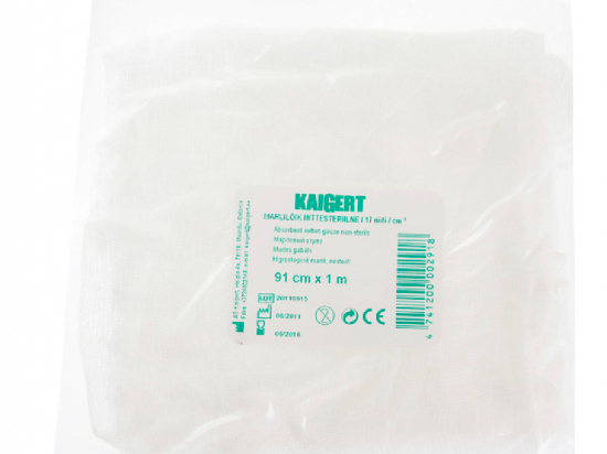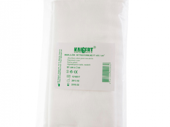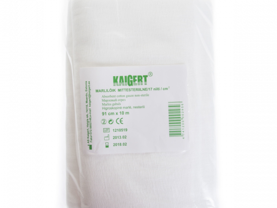 <p><strong>Kasutamisjuhised</strong><br /> Kasutamine:<br /> 1. Ava pakend. 2. Võta sidumisvahend välja. 3. Soorita vajalik protseduur. 4. Pane kasutatud sidumisvahendid utiliseerimiskonteinerisse.<br /> <br /> <strong>Hoiatused ja ettevaatusabinõud</strong><br /> Tähelepanu!<br /> Mittesteriilseid sidumismaterjale ei tohi teist korda kasutada.<br /> Ära kahjusta pakendit!<br /> Sidumisvahendid ei tohi olla otsese päikesekiirguse all, puutuda kokku õlide, bensiini, hapete, aluste ja teiste ainetega, mis võivad toodet kahjustada.<br /> <br /> <strong>Säilitamistingimused</strong><br /> Säilitamine:<br /> Hoia sidumisvahendeid ruumis temperatuuril +10C kuni +25C.<br /> <br /> <strong>Seadme ja pakendi sisu</strong><br /> 100% puuvillane marli.<br /> Marli on pakitud polüetüleenpakenditesse.<br /> <br /> <strong>Tootja või tootja volitatud esindaja</strong><br /> Tootja: AS Kaigert,Haigla 4a, Maardu linn, Harju maakond, 74116<br /> <br /> <strong>Päritoluriik</strong><br /> Eesti</p>