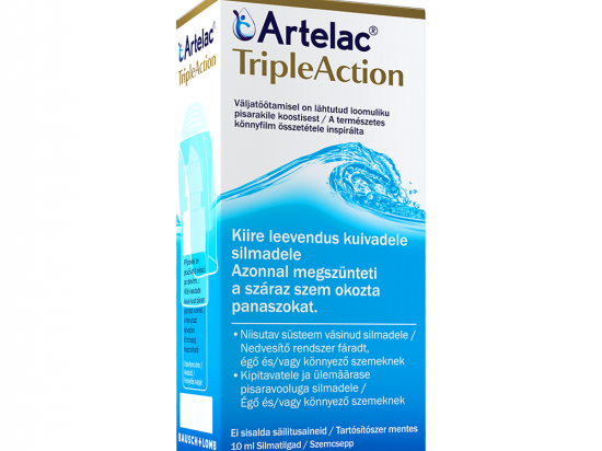 <p>Artelac Triple Action on täiustatud lahus, mille välja töötamisel on lähtutud loomuliku pisarakile koostisest. See sisaldab looduslikku niisutajat hüaluroonhapet (naatriumhüaluronaadina), mida leidub inimese silma struktuurides ja loomulikus pisarakiles. Veel sisaldab toode lisaniisutajaid: glütserooli, karbomeeri. Toode sisaldab täiendavat lipiidkomponenti (keskmise ahelaga triglütseriidid), naatriumhüdroksiidi ja süstevett. Tänu oma koostisele toetab Artelac Triple Action pisarakile kõiki kolme kihti: lipiidi-, vee- ja mutsiinikihti.</p> <p>Artelac Triple Action on mõeldud jääma silma pinnale, pakkudes intensiivset niisutust ning leevendades sümptomeid kohe ja pikaks ajaks. See sobib suurepäraselt erinevate kuivsilmsuse vormide korral, nt väsinud, stressis silmad, puru-, kipitustunne silmas või pisaravool.</p> <p>Säilitage temperatuurivahemikus +1 °C kuni +25 °C.</p> <p>Tootja: Dr. Gerhard Mann chem.-pharm. Fabrik GmbH Bru2nsbütteler Damm 165/173 13581 Berliin, Saksamaa.</p> <p>Turustaja: AS Sirowa Tallinn, Salve 2c, 11612 Tallinn. Tel: +372 6830700</p>
