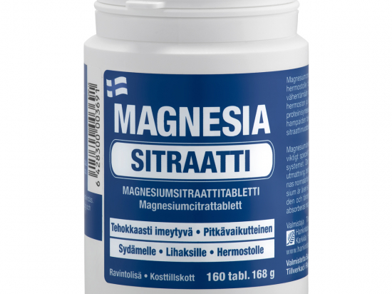 <p>Magneesium aitab:</p> <p>*vähendada väsimust ja kurnatust,aitab kaasa närvisüsteemi ja lihaste normaalsele talitlusele ja valkude sünteesile.</p> <p>*hoida ka luid ja hambaid normaalsetena.</p> <p>Orgaaniline magneesium (tsitraadina) imendub hästi. Magneesium lõõgastab veresooni ja on oluline südamelihase häireteta tööks.</p> <p><strong>Netokogus:</strong> 90tbl, 180g</p> <p><strong>Tootja: </strong>Hankintatukku OY, Karkkila, Soome.</p> <p><strong>Maaletooja:</strong> Loodustoode OÜ, Kadaka tee 1/3, Tallinn. Tel. 6660091.</p>